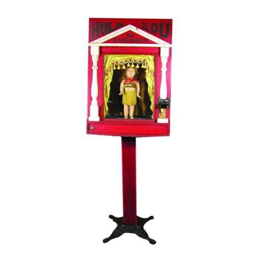 Hula Lu Coin Op Dancing Girl on Oak and Cast Iron Base. Good Working Condition. Quarter Play. 24 x 65 x 18 inches.