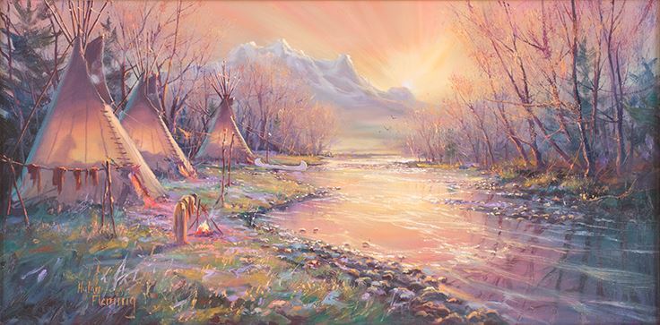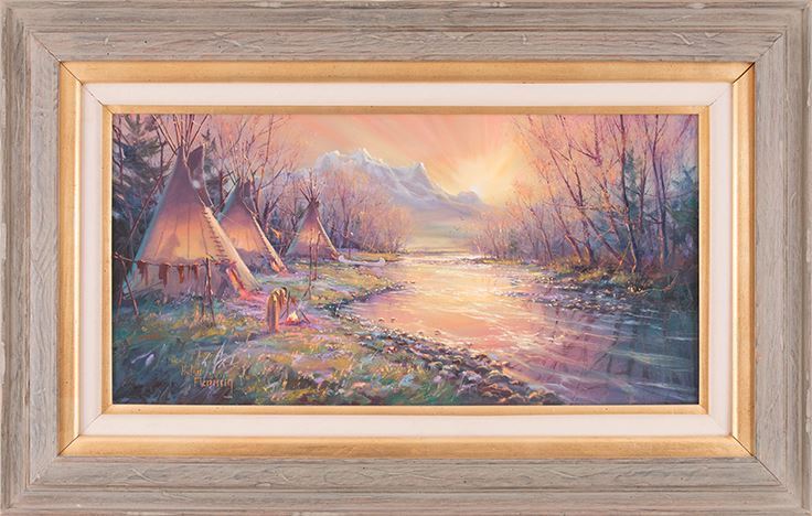 Hulan Fleming (1933 - ). Sunset Camp. 15" x 29" oil on board. Signed lower left .