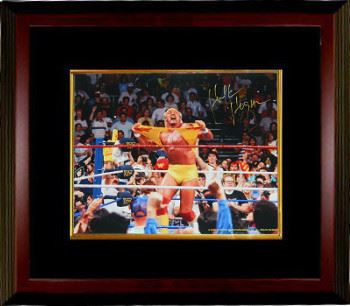 Hulk Hogan, is an American professional wrestler, actor, television personality, entrepreneur, and musician currently signed with WWE. Hogan enjoyed mainstream popularity in the 1980s and 1990s as the all-American character Hulk Hogan in the World Wrestling Federation (WWF, now WWE), and as "Hollywood" Hulk Hogan, the villainous nWo leader, in World Championship Wrestling (WCW). A regular pay-per-view headliner in both organizations, Hogan closed the respective premier annual events of the WWF and WCW, WrestleMania and Starrcade, on multiple occasions. He was inducted into the WWE Hall of Fame in 2005. Hulk Hogan has hand signed this 16x20 Photo. Schwartz Sports Certificate of Authenticity from Athlon Sports. Custom Black Mat and Premium Mahogany Color Framed as shown.