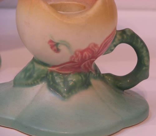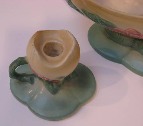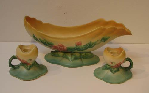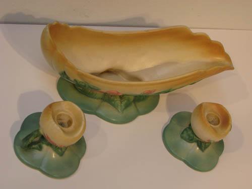 Title: Ceramic Table Garniture Set with pair of candlesticks and centerpiece decorated with yellow floral relief