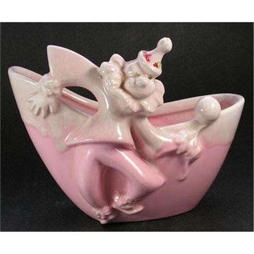 Produced by Hull,circa 1940s, this rare clown planter, vase or bowl is marked on the bottom Hull - USA - 82. Measures 8 1/2 inches across x 6 1/2 inches tall x 4 inches deep and, with only minor loss of the cold paint on the clown, due to age, is in excellent condition