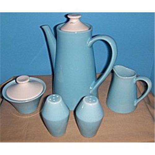 Hull- 7 pc. coffee set, though we are not quite sure what salt & pepper have to do with coffee... In all honesty they are part of the whole, as Hull also had table service in this style (plates, bowls, cups and saucers). These pieces are all in excellent condition with the exception of the coffee server. There is a small chip on the underside of the end of the spout, you will feel it before you see it, and it will not interfere with pouring...