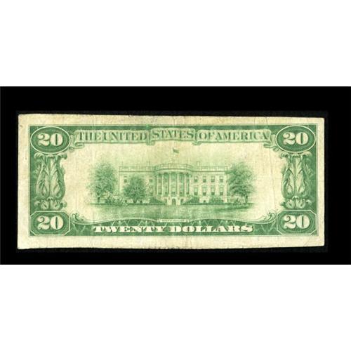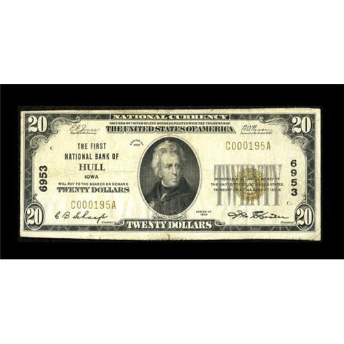 <B>Hull, IA</B></I> - $20 1929 Ty. 1 <B>The First NB</B></I> Ch. # 6953<BR> This note is one of only 11 small in the census. The surfaces are soft on this $20 that last crossed the auction block in 1998. <B>Very</B></I> <B>Fine</B></I>.<BR><BR><b>Shipping:</b> Coins & Currency (<a target="_blank" href="http://www.heritageauctions.com/common/shipping.php">view shipping information</a>)