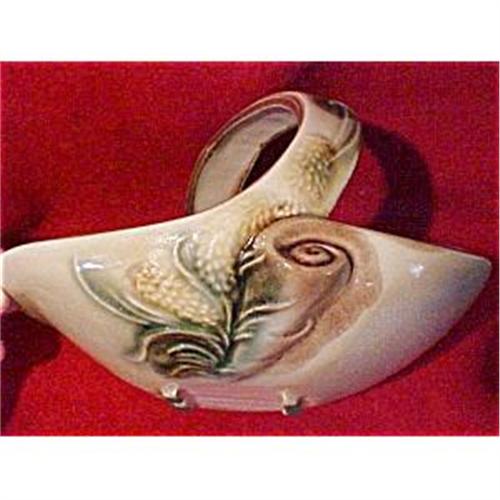 Hard to find Parchment and Pine basket from Hull Pottery. Looks like the S-3 design. Approx 8 1/2 inches at the base with felt tips added to prevent scratching your table. Unmarked, with no chips/cracks or crazing. One bubble on the inside is a little rough.