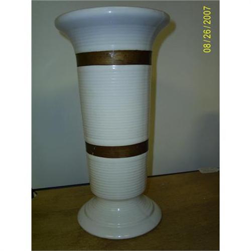 Very nice, large vase by Hull. Crafted in a cream colored background, with copper, or gold colored bands. There are no chips, cracks, crazing, breaks, etc....but it looks as the bands may have been touched up; therefore listing as good instead of very good-excellent.