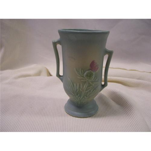 Hull USA #54 6.3/4 Vase 2 handles. Matte finish Blue with Pink Flower Has no cracks or chips.
