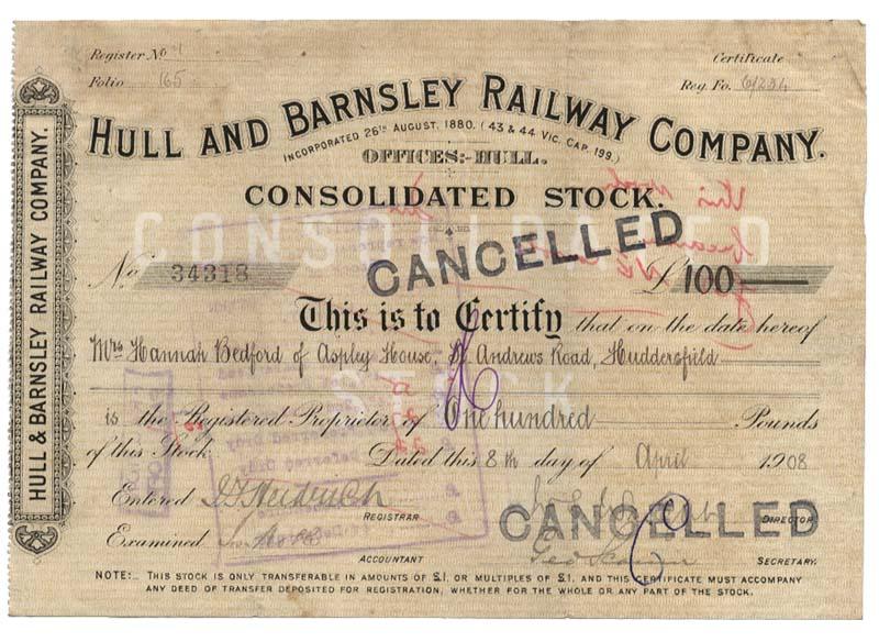 1908. Hull, England. Consolidated Stock. Black/Brown. Lightly stamp cancelled. Folds. Fine.