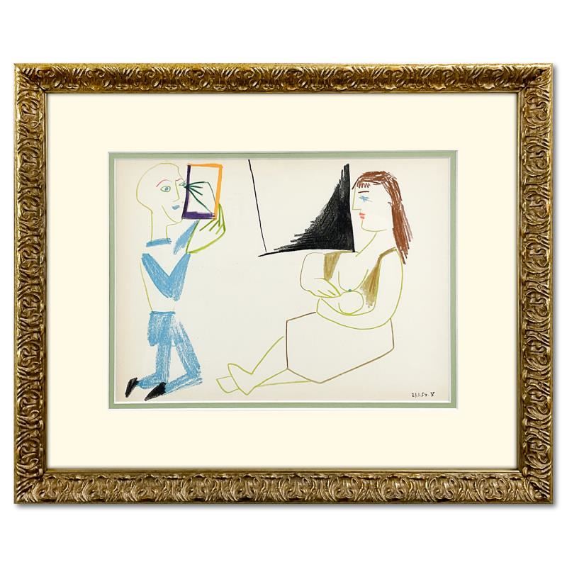 Human Comedy (27.1.54.V) by Picasso (1881-1973). Please see photos and description for all available information. "Human Comedy (27.1.54.V)" is a lithograph on paper by Picasso (1881-1973). This piece comes custom framed. Includes Letter of Authenticity. Measures approx. 22.5" x 19"(frame), 12.5" x 9" (image). There is a small scuff on the acrylic protective cover.