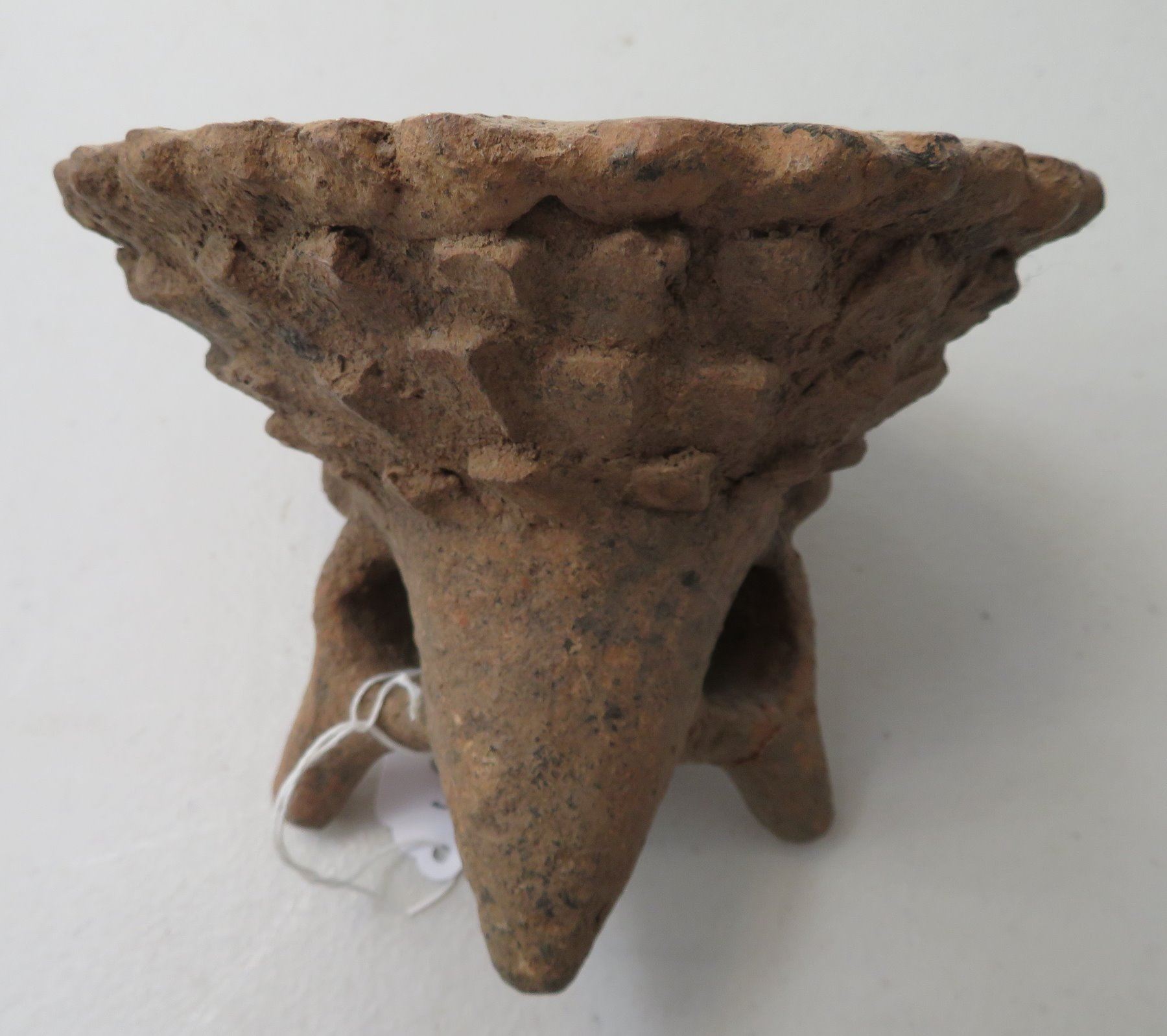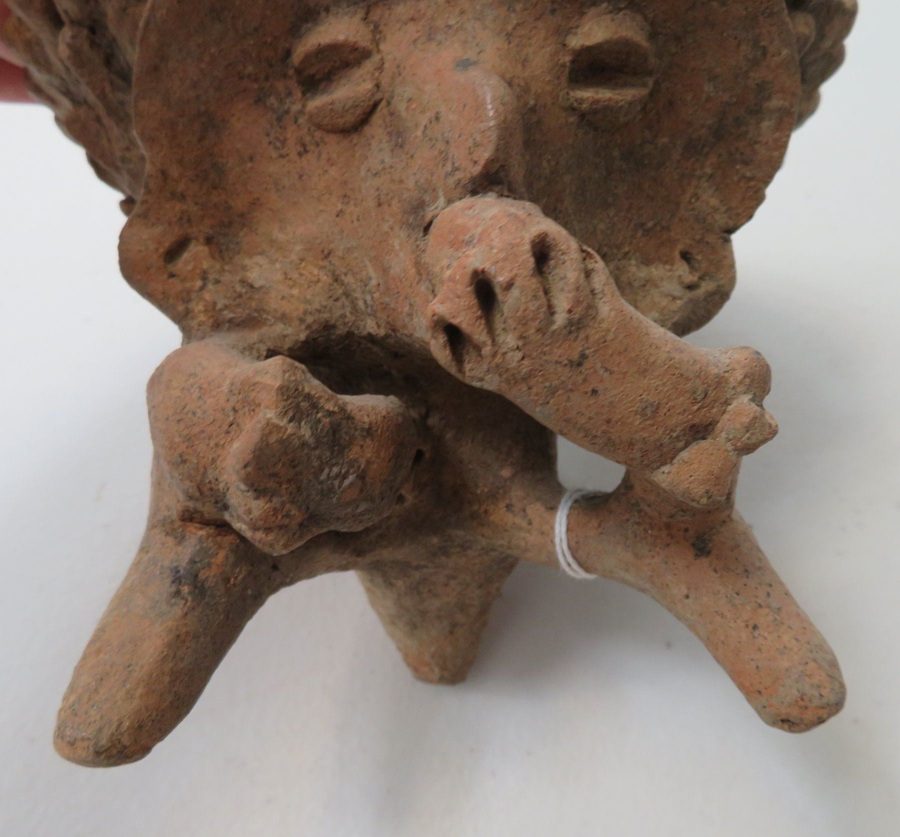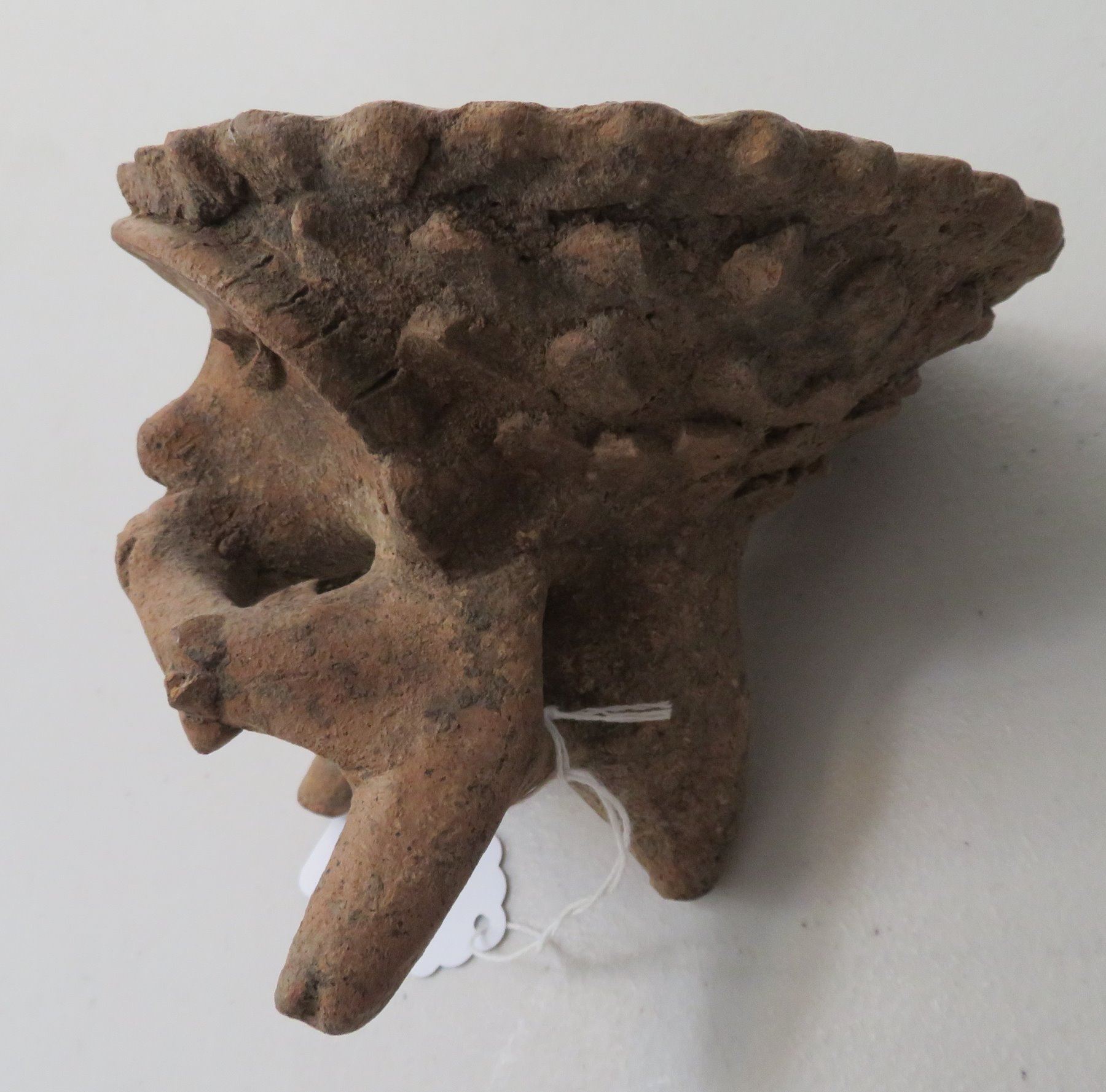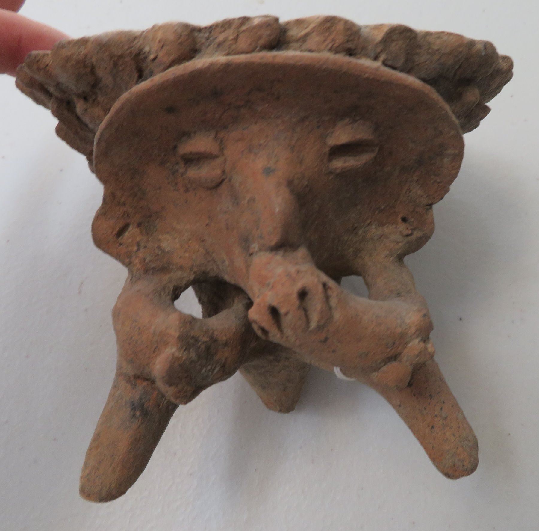 Human Effigy Bowl, pre-Columbian item. Made of clay, the item measures 5" x 4 1/2" x 4 1/2". Central Mexico. From an old and large, Rancho Sante Fe, Calif. estate, originally collected by a dentist. Condition: Some wear, leg broken and glued, see images. Shipping: $25.50 w/insurance and signature, due to value.