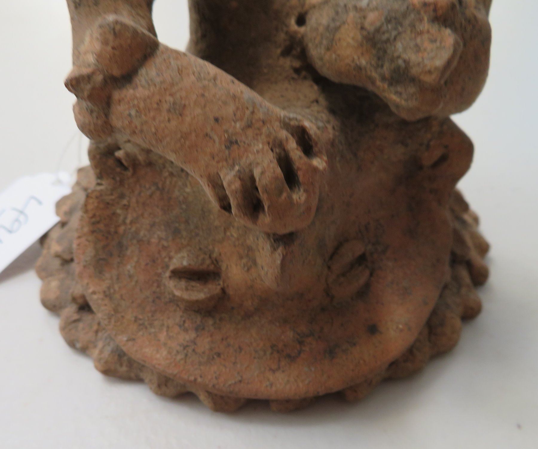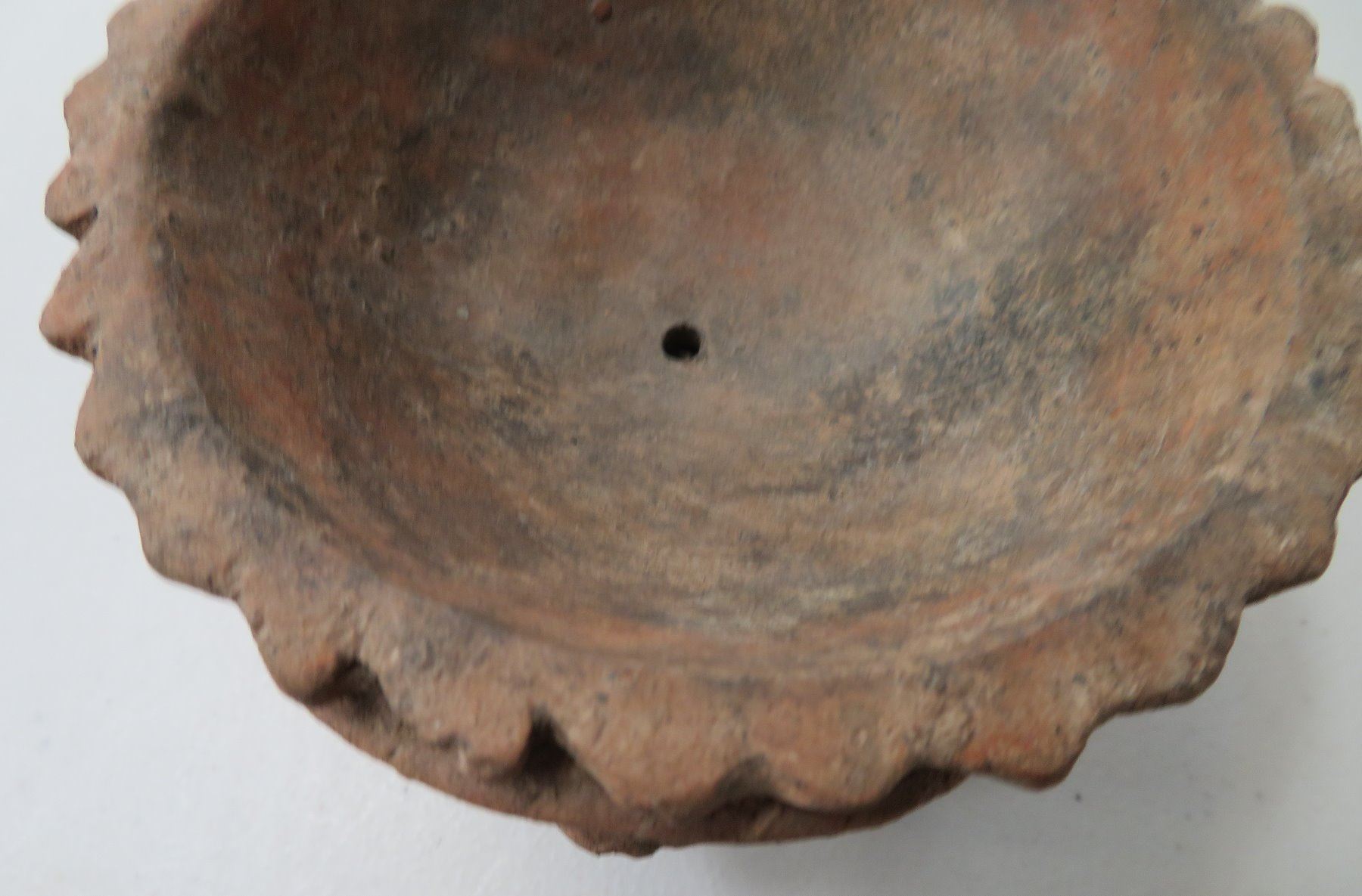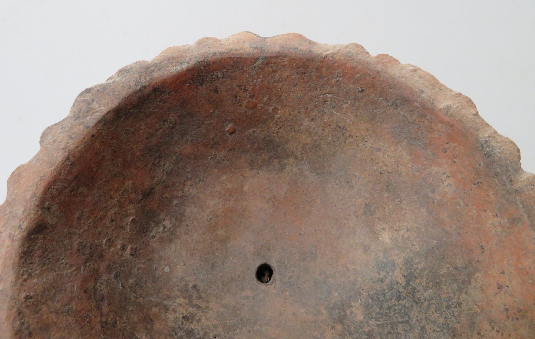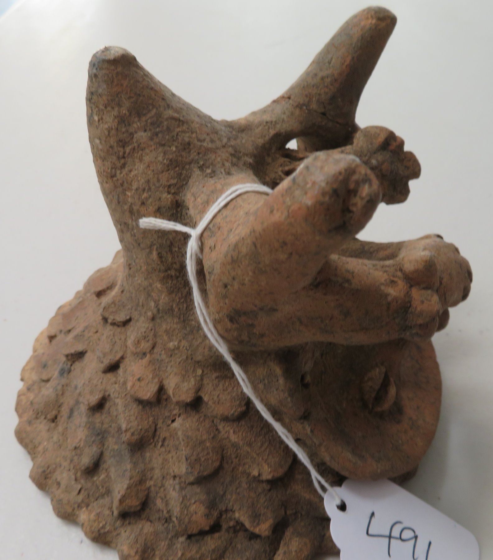Human Effigy Bowl, pre-Columbian item. Made of clay, the item measures 5" x 4 1/2" x 4 1/2". Central Mexico. From an old and large, Rancho Sante Fe, Calif. estate, originally collected by a dentist. Condition: Some wear, leg broken and glued, see images. Shipping: $25.50 w/insurance and signature, due to value.