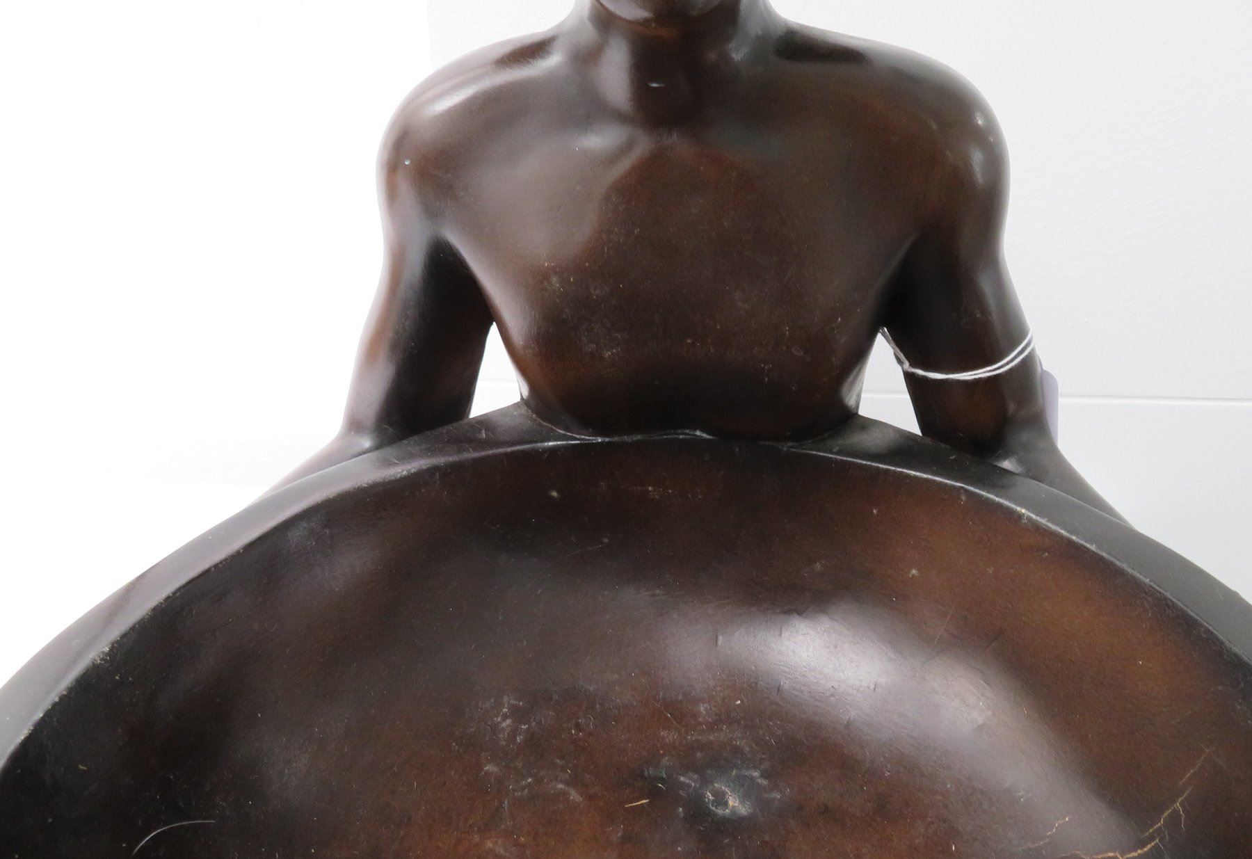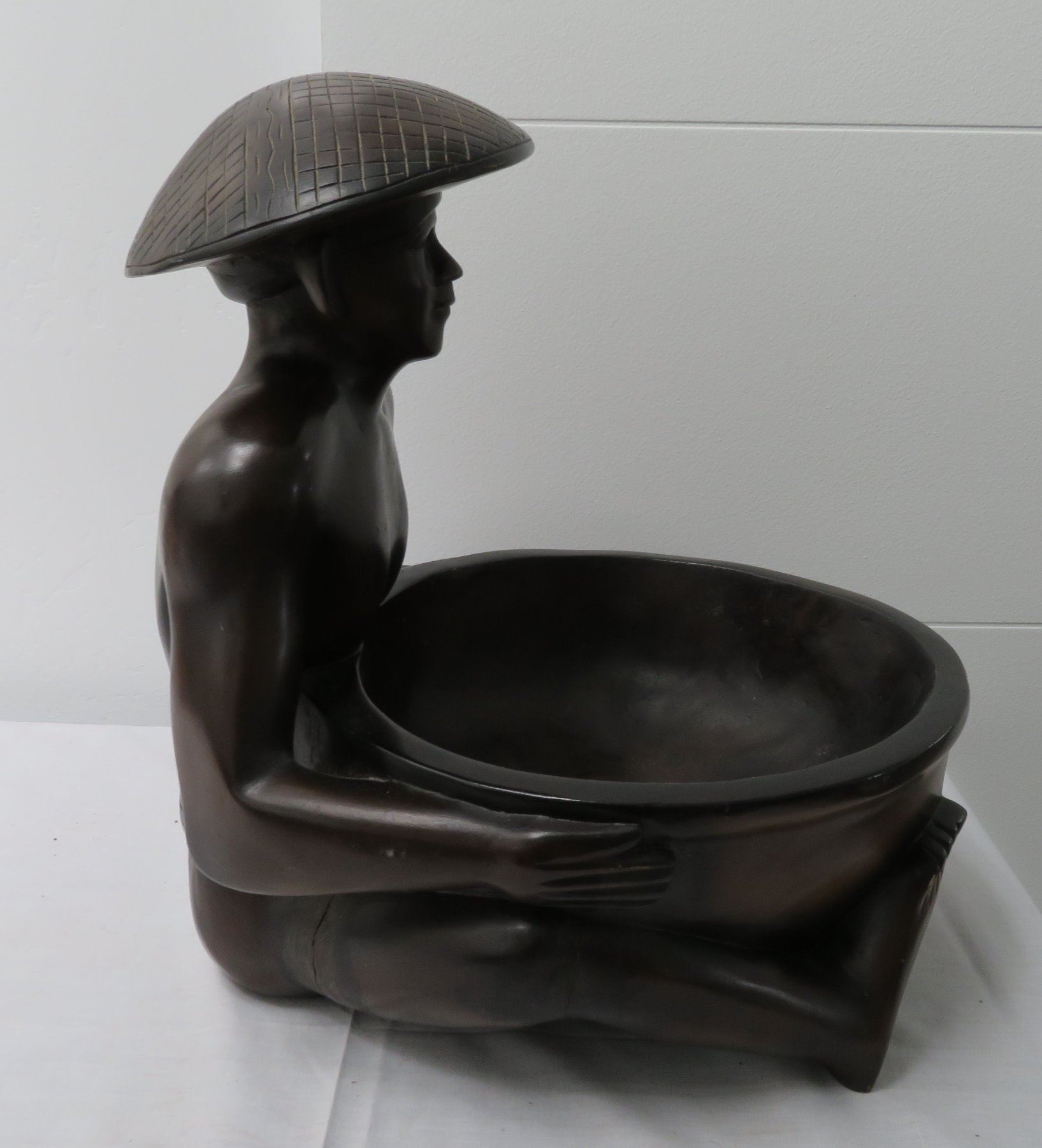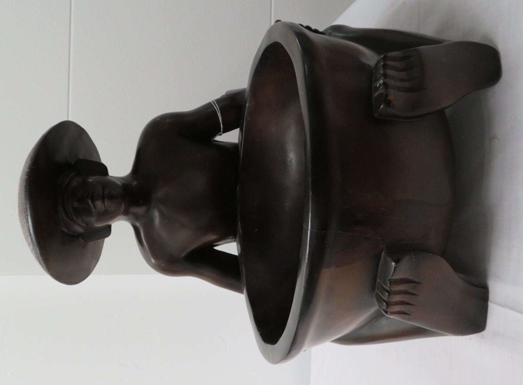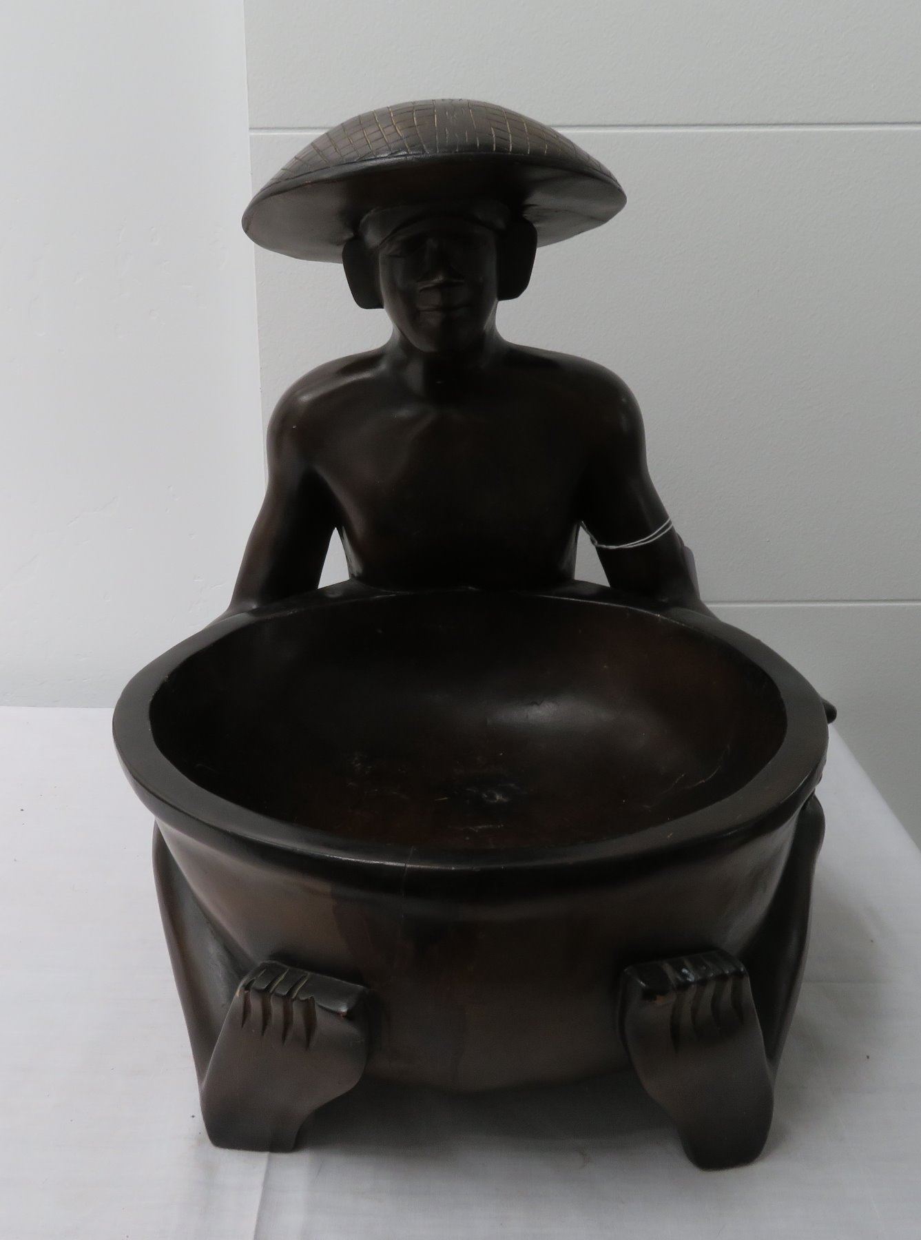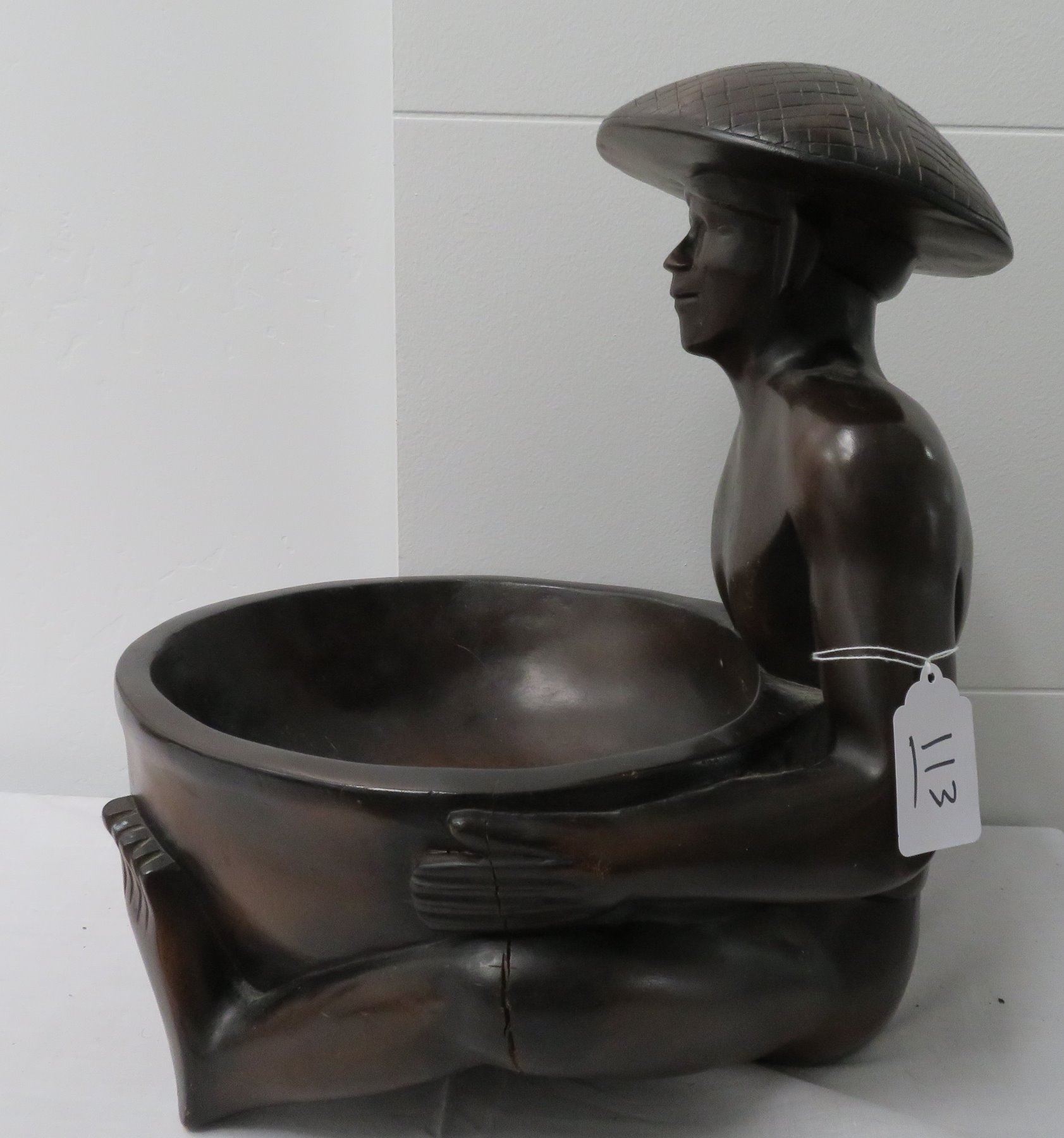 Human Effigy w/Large Bowl, c. 1940s. Made of mahogany, the item measures 19" x 14" x 15". Philippines. Quite large, well-made piece. Condition: Very fine carving, see images. Shipping: $65.00 USA estimate only, due to size and weight.