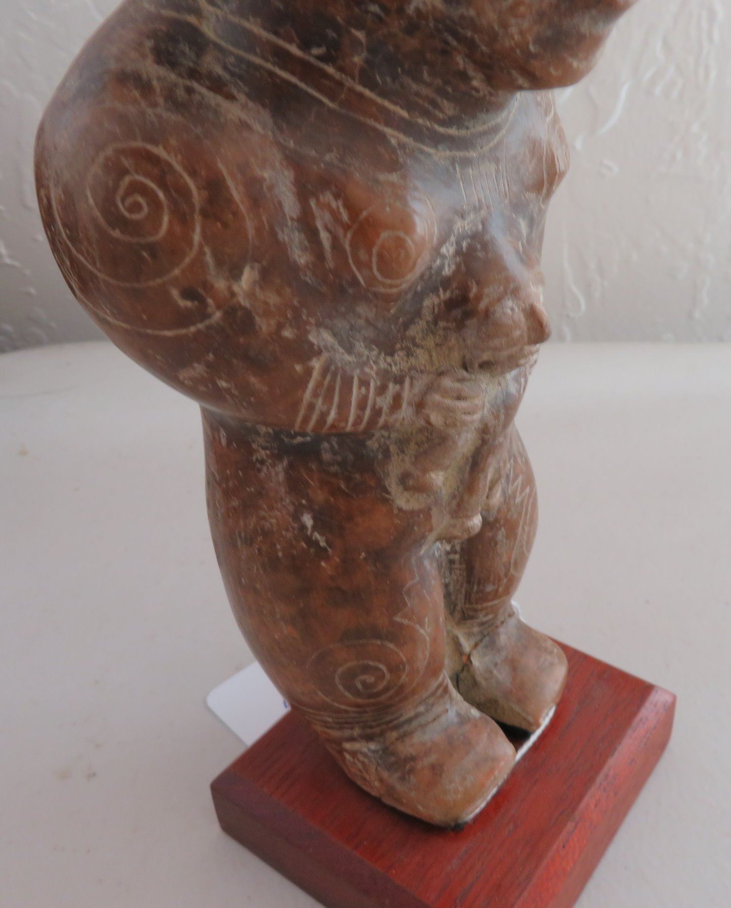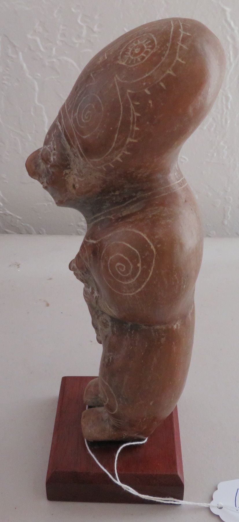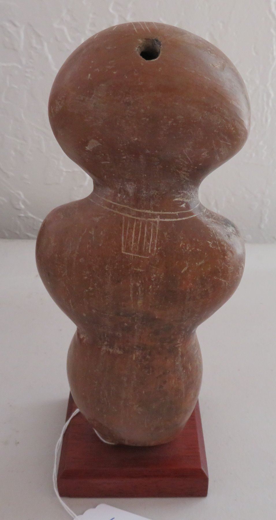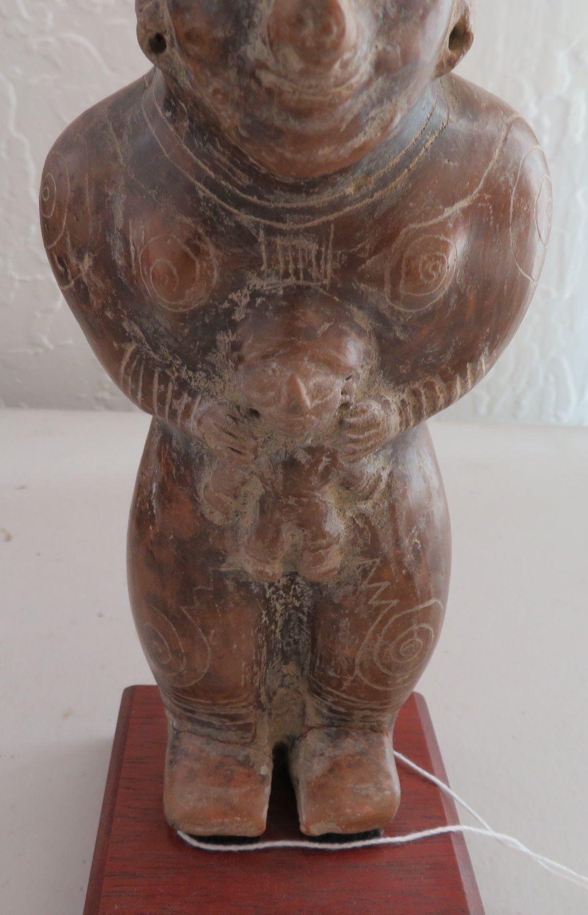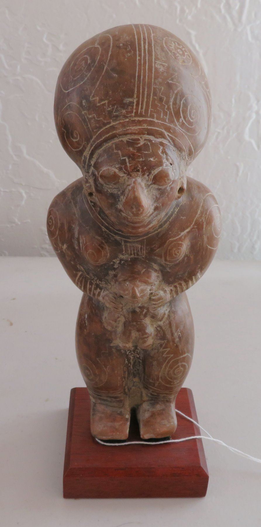 Human Figure w/Child, pre-Columbian item. Made of clay and paint, the item measures 9" x 3 1/2". Guangala, South America. Has stand. Condition: Good, see images. Shipping: $30.00 w/insurance and signature, due to size and value.