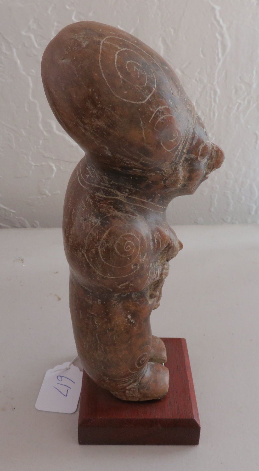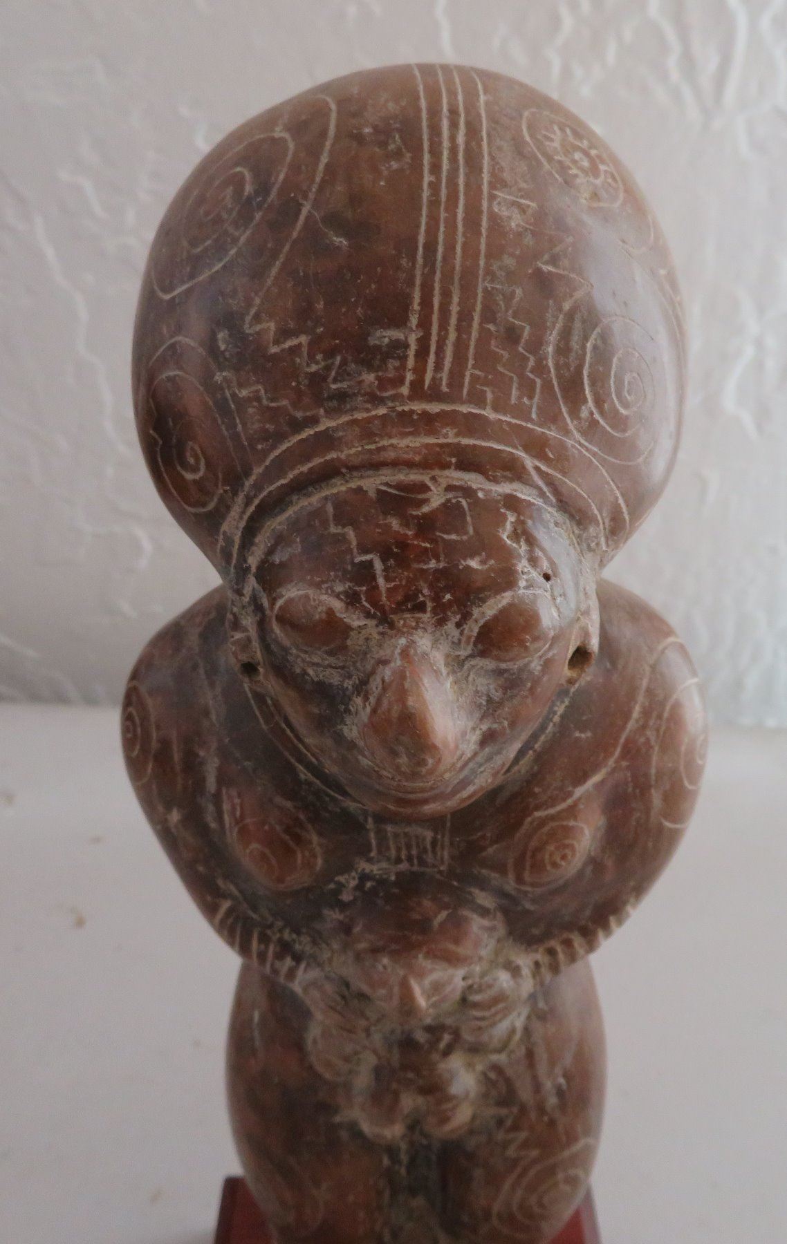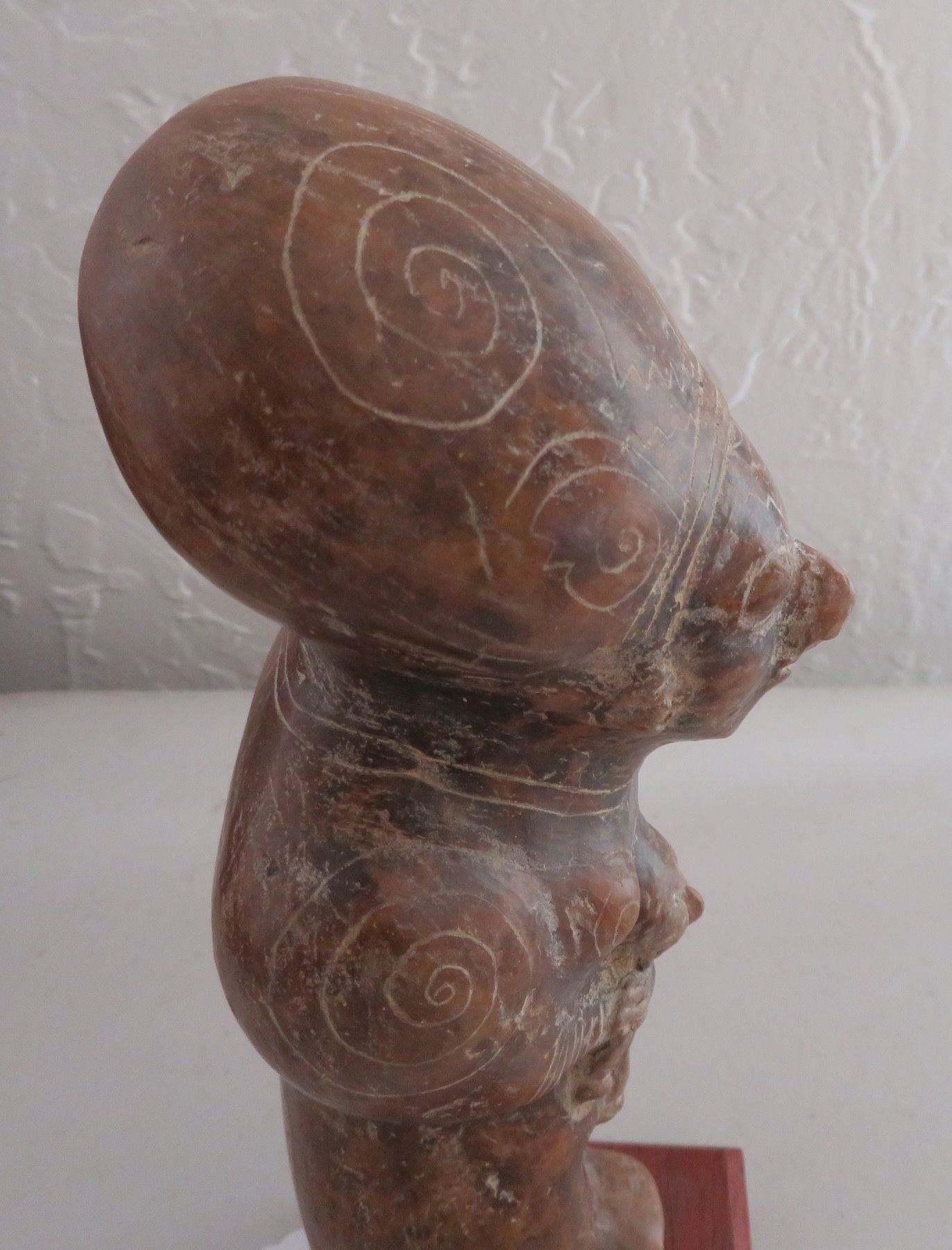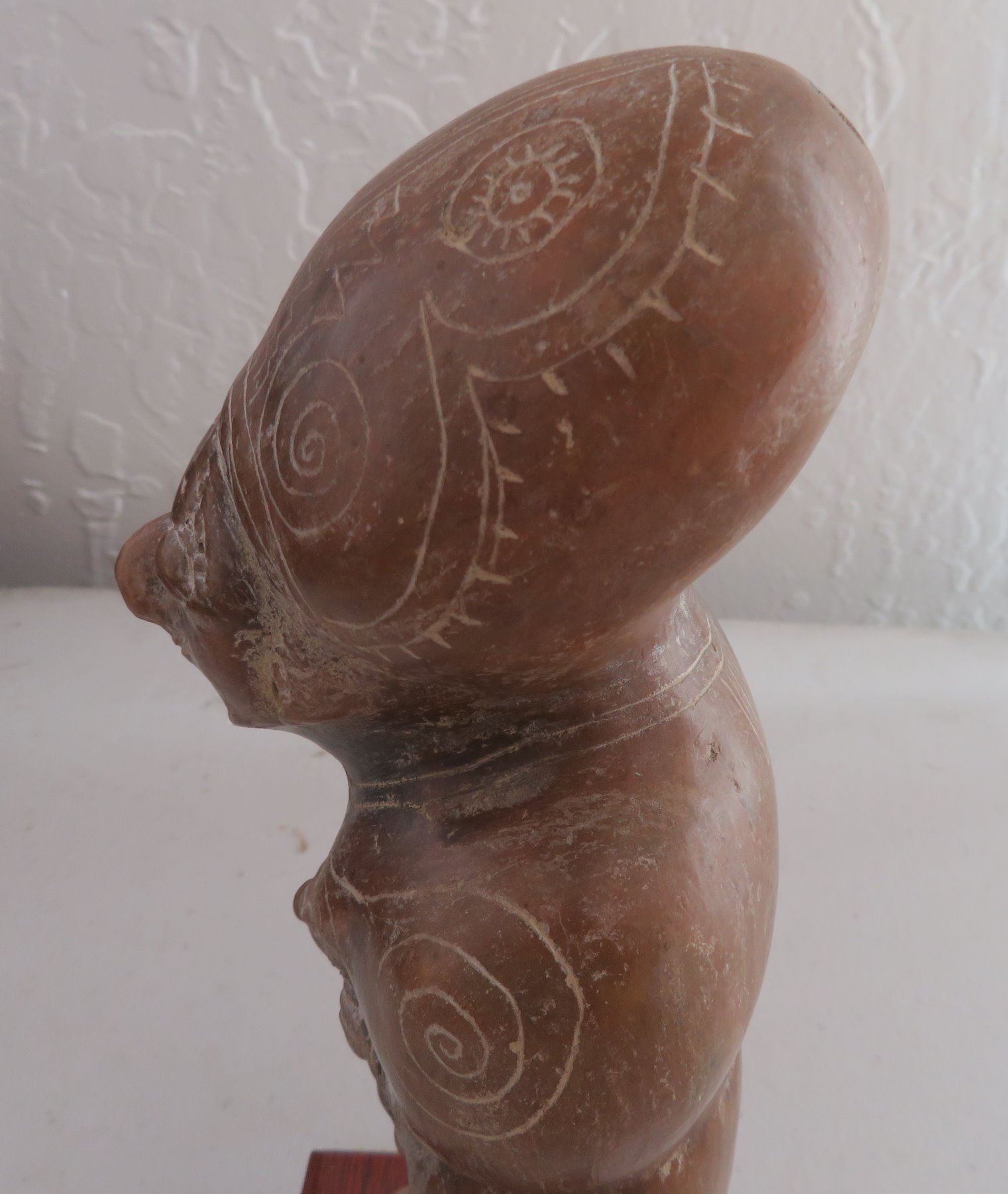 Human Figure w/Child, pre-Columbian item. Made of clay and paint, the item measures 9" x 3 1/2". Guangala, South America. Has stand. Condition: Good, see images. Shipping: $30.00 w/insurance and signature, due to size and value.
