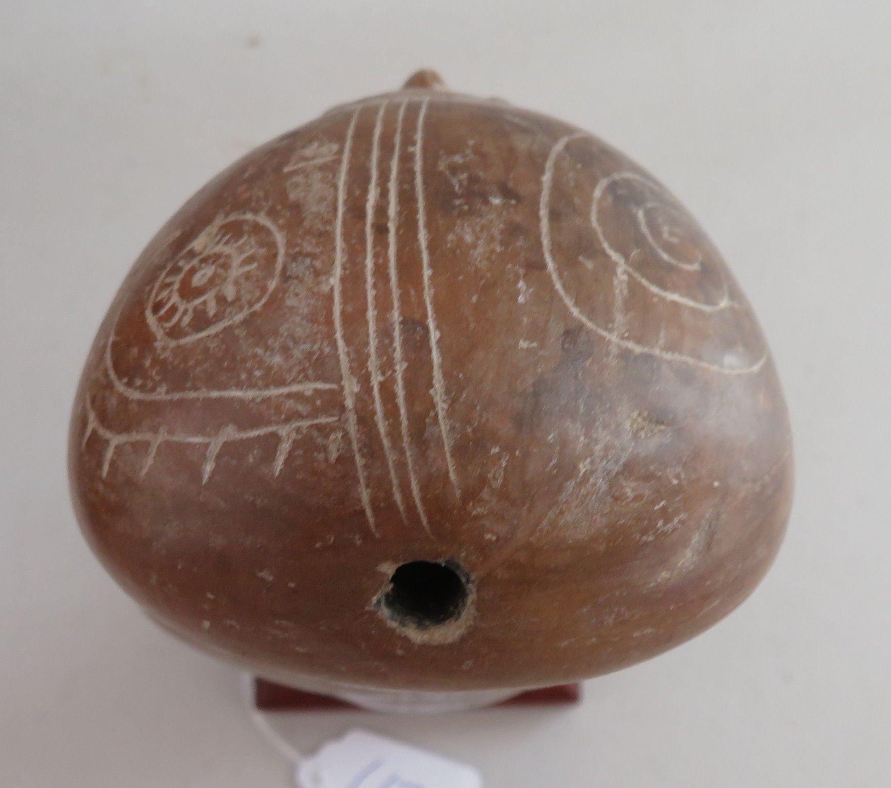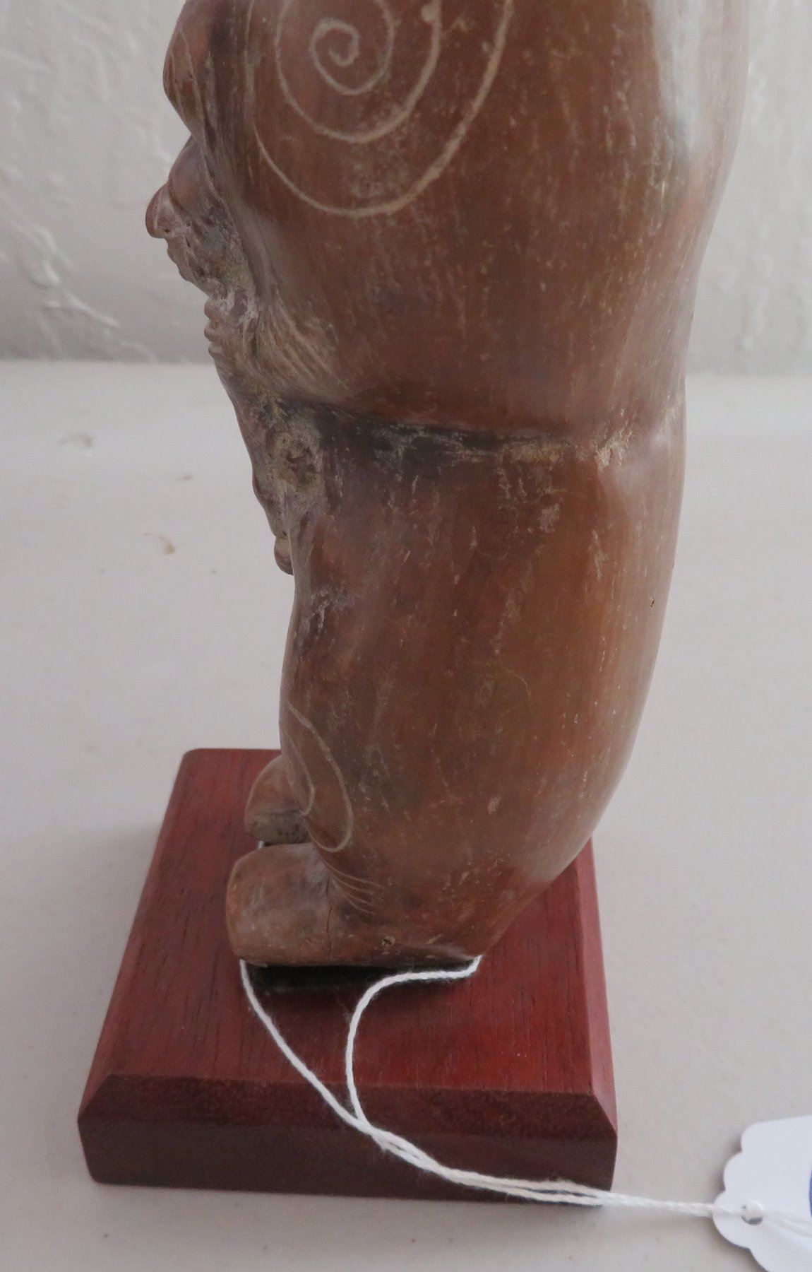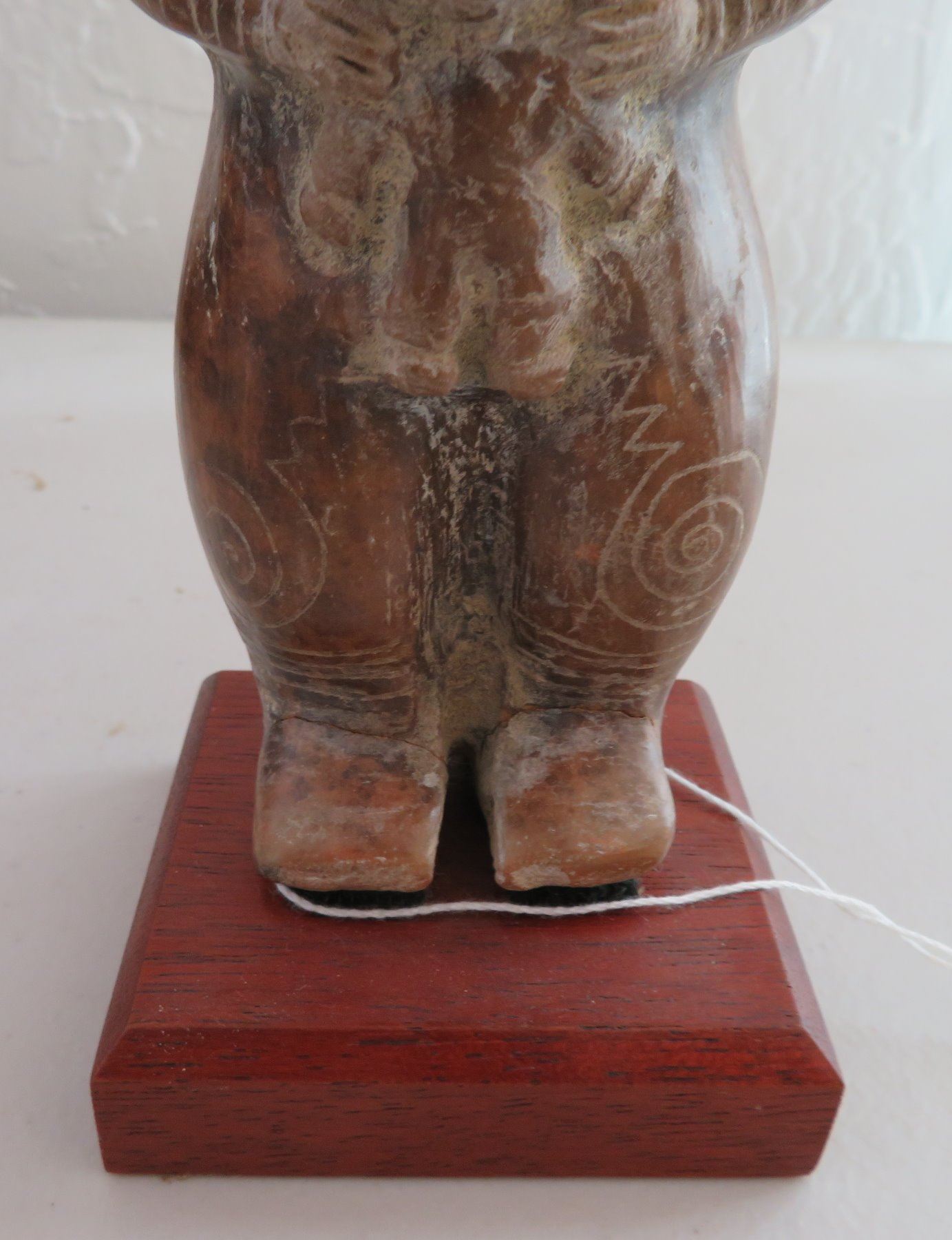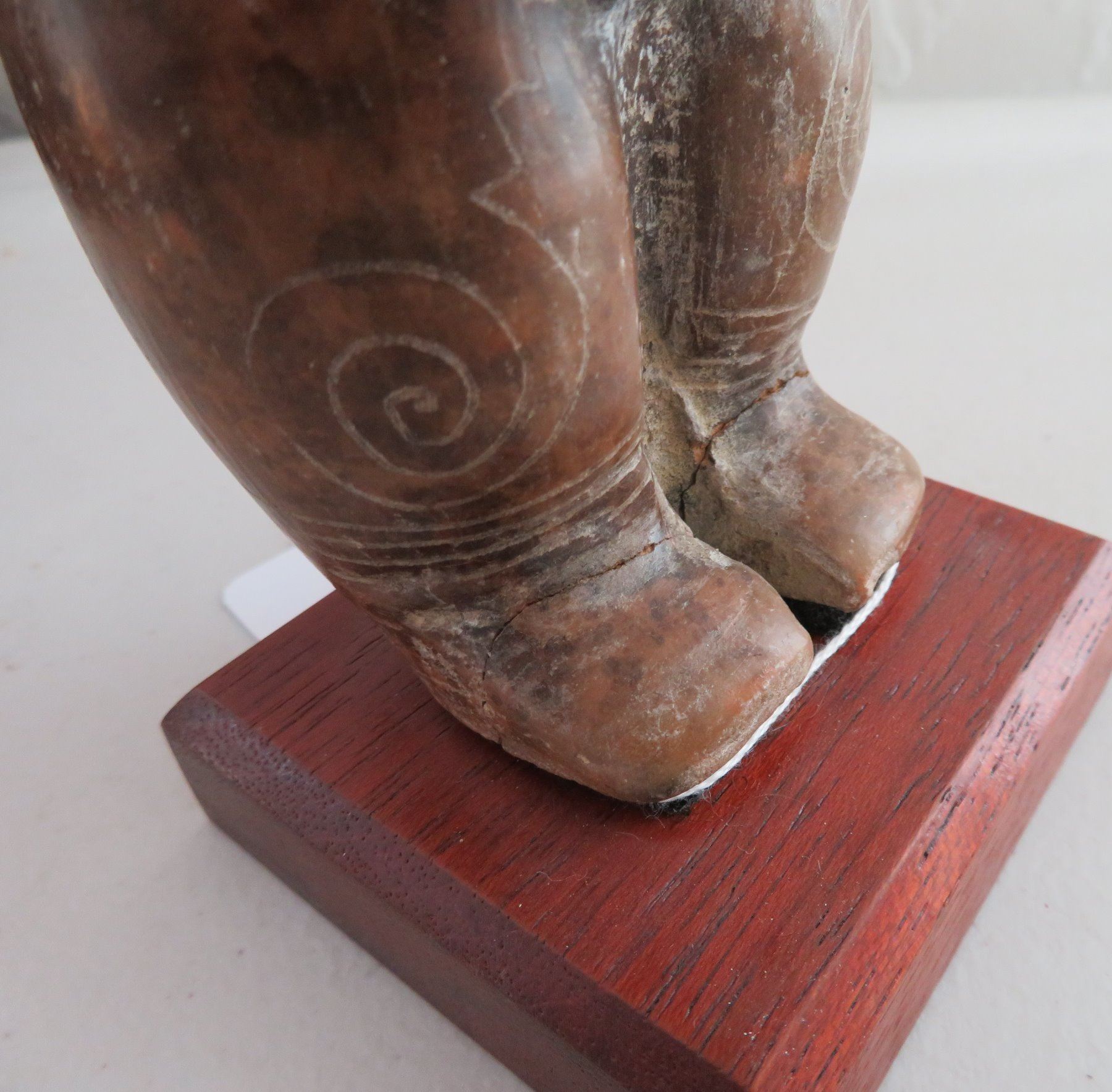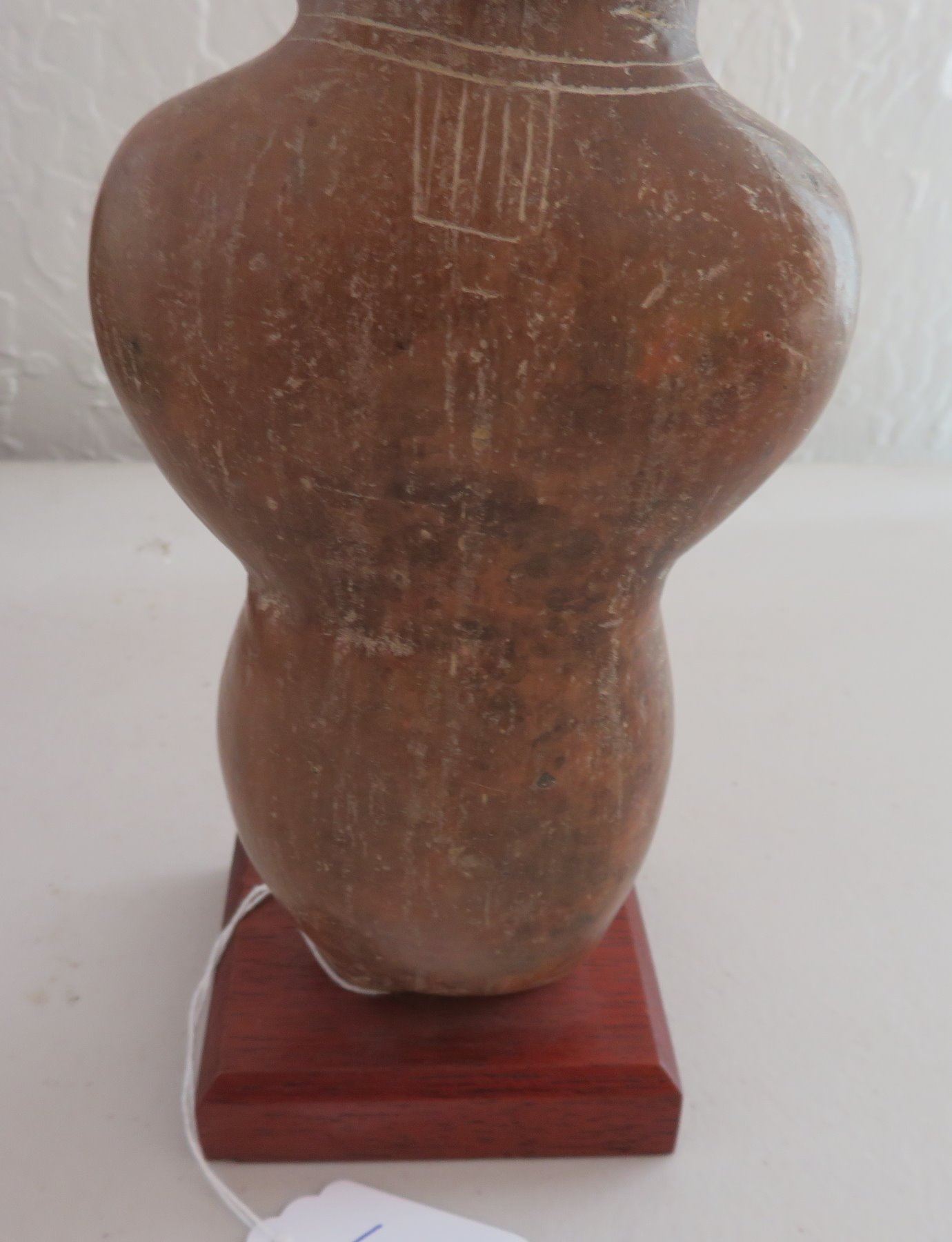 Human Figure w/Child, pre-Columbian item. Made of clay and paint, the item measures 9" x 3 1/2". Guangala, South America. Has stand. Condition: Good, see images. Shipping: $30.00 w/insurance and signature, due to size and value.