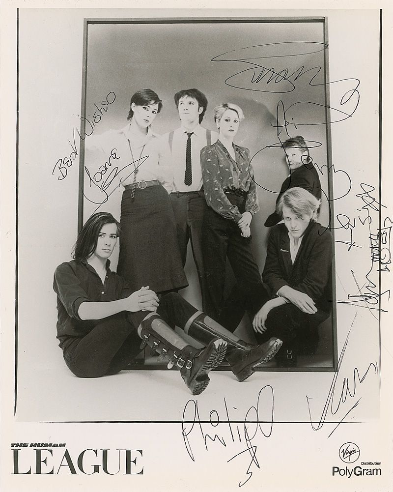 Glossy 8 x 10 PolyGram publicity photo, signed in black ink by all six members, with most just signing their first names. In fine condition, with a couple scattered surface creases and light binder dings to the right edge. Originally obtained by Bob Roper of WEA Canada.
