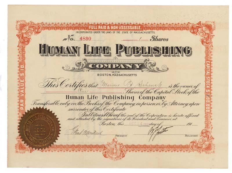 1910, Massachusetts. Stock certificate for 1 share. Orange/black. Gold seal at bottom left. Uncancelled and very fine.