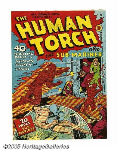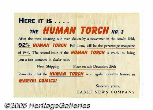 <B>Human Torch #3 (#2) Promotional Cover Announcement (Timely, 1940).</B></I> This rare promotional comic cover announcement is a little different from the others offered in this auction, in that it is a folded two-page spread with Alex Schomburg's cover art to <B>Human Torch</B></I> #3 (#2) on the front, a blank back, and the message to distributors spread across both "interior" pages. The message from Kable News Co. inside reads, "Here it is... the <B>Human Torch</B></I> No. 2. After the most amazing sale ever shown by a newcomer in the comics field, 92%, <B>Human Torch</B></I> Fall Issue, will be the percentage magazine of 1940. The second issue of <B>Human Torch</B></I> is ready to bring you a fast turnover in dealer sales. Now Shipping -- Place on sale December 20th...." The distributor who originally received this announcement recorded the date "12-18-40" on the front in pencil. This announcement has some water stains and the standard two horizontal folds to facilitate mailing in a standard business envelope, but is otherwise in Excellent condition.