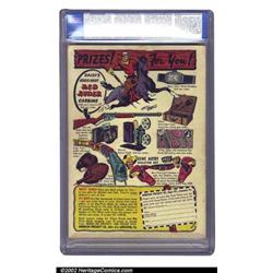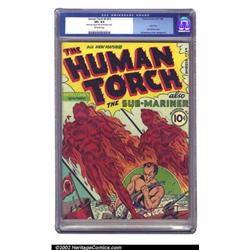 Human Torch Comics #1 (Timely, 1940) CGC VF+ 8.5 Off-white pages. Torch and Toro flame on for their introductory issue, joined by the Sub-Mariner taking a Nazi sub downtown. One of the four "big" Timely keys, Torch #1 has always been a collector favorite. This copy is in pristine condition, and has a brightness that you don't often see. There is a light corner crease and stain on the back cover, which do not detract from this book's overall eye-appeal. Overstreet 2002 VF 8.0 value = $17,500. Important notice: We expect to be auctioning lots at the rate of 200-250 per hour. Sometimes eBay Premier live bid software cannot keep up with that pace, so we strongly recommend that you place a realistic proxy bid now as insurance to avoid disappointment. Also please note that all Heritage/CAA lots purchased through eBay Premier carry a 20% Buyer's Premium. Please make sure you read the Terms and Conditions.