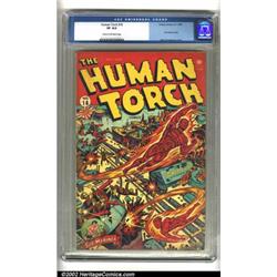 Human Torch Comics #16 (Timely, 1944) CGC VF 8.0 Cream to off-white pages. This incredible Human Torch cover by Alex Schomburg is a classic. The Sub-Mariner makes a small action appearance on the cover in a bubble and inside in his own story. Brilliant color saturation makes this a very beautiful comic. 2002 Overstreet VF 8.0 value = $738. Important notice: We expect to be auctioning lots at the rate of 200-250 per hour. Sometimes eBay Premier live bid software cannot keep up with that pace, so we strongly recommend that you place a realistic proxy bid now as insurance to avoid disappointment. Also please note that all Heritage/CAA lots purchased through eBay Premier carry a 20% Buyer's Premium.
