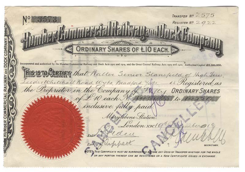 1911, England. Ordinary Shares of 10 Pounds each. Black with embossed red seal. Stamp cancelled and Extremely Fine.