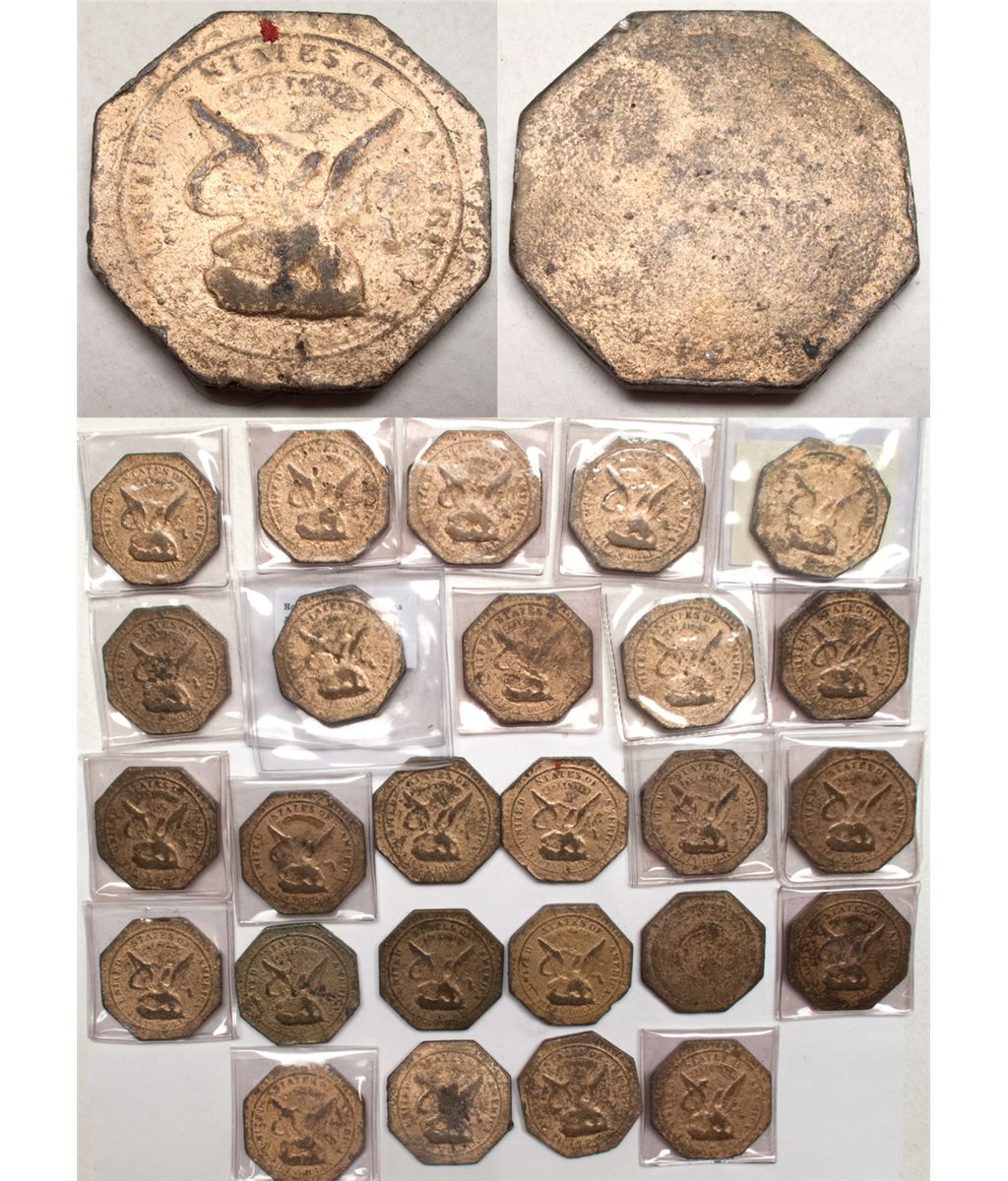 Own a piece of Hollywood history with these crude cast copies of the Humbert $50 slugs, vague outlines visible. Cast in lead and then plated to look like gold. Weber's notes state, "Certainly this is the most 'romantic' of slug facsimiles when you consider the number of famous Hollywood stars who handled these pieces. All examples evidence time spent traveling on a Wells Fargo stage, in a local bank safe, and eventually into a desperado's buckskin pouch. Lot of 26. Bill Weber Collection. City: HollywoodCounty: State: CADate: