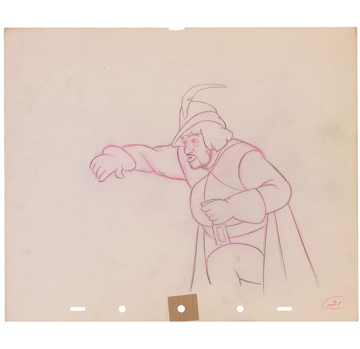 (Walt Disney Studios, 1937) Original ‘rough’ production drawing featuring Humbert the Huntsman from Snow White and the Seven Dwarfs. Accomplished in colored pencil and graphite on untrimmed 11.75 x 10 animation paper. Image measures 7 x 7.5. In fine condition.