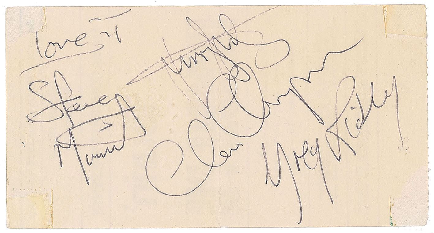 Vintage ballpoint signatures of Steve Marriott, Clem Slempson, Greg Ridley, and Jerry Shirley on the reverse of a 2.75 x 5 ticket stub for Humble Pie's show in Dusseldorf on October 26, 1974. In fine condition, with a central vertical fold and old tape remnants to the corners.