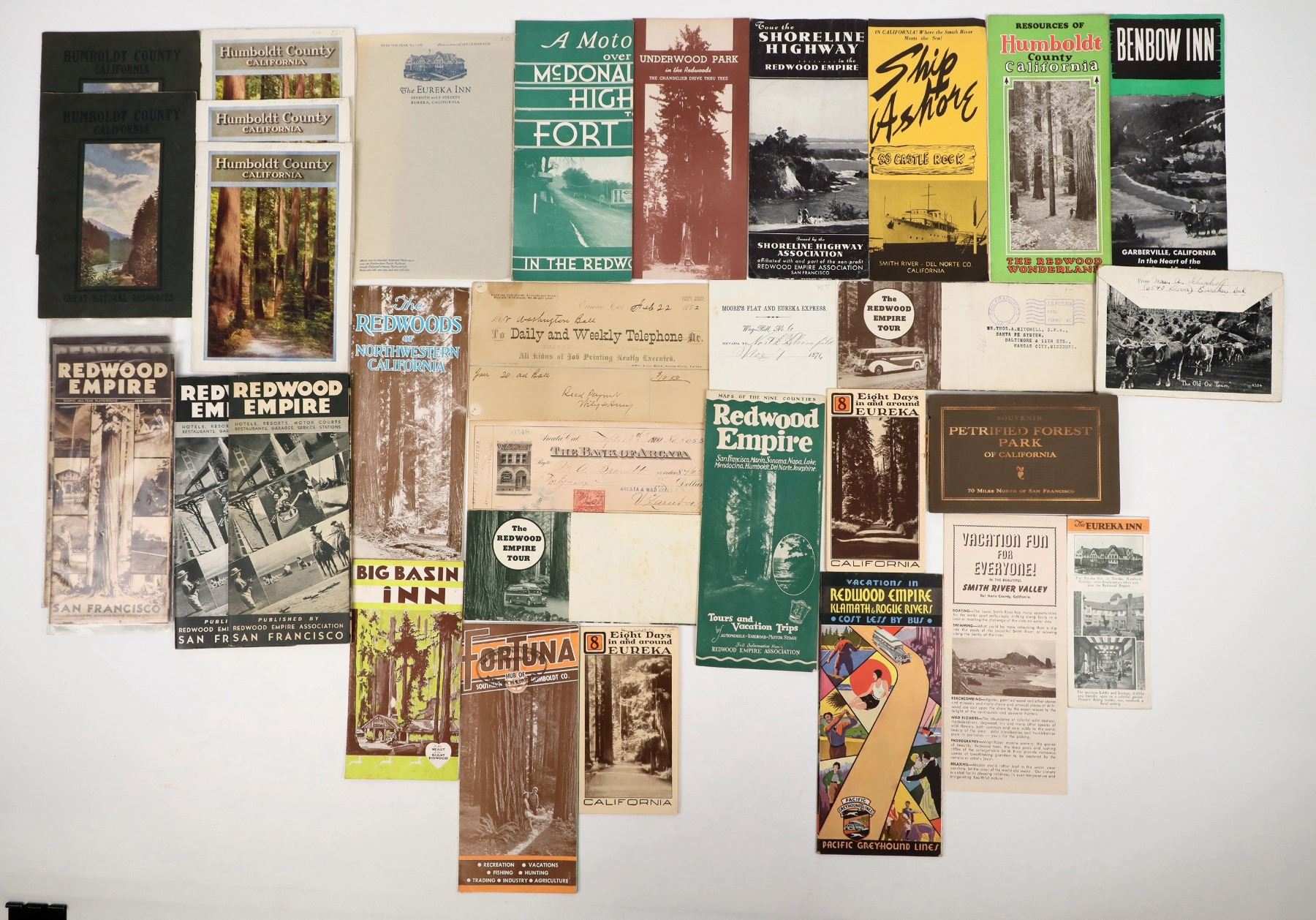 Huge lot of Humboldt County ephemera. This group has maps, photos, Hotel and resort flyers and foldouts, you name, it is likely here. There are some duplicates, and many one-of-a-kind items you will not have seen previously. Multiple items expounding the Redwood Empire, the big trees, the rugged coastlines and the many towns the dot the area. Eureka, Fortuna, Arcata, Trinidad, Benbow, to name a few. Multiple Eureka Hotel flyers, a vintage photo album of the Petrified Forest, tickets, schedules, and more. (3) Humboldt County colorized booklets, and far too much to list here. Please see photos.