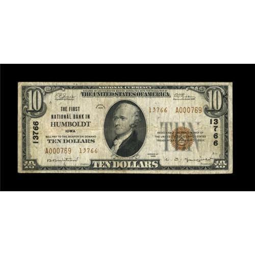 <B>Humboldt, IA</B></I> - $10 1929 Ty. 2 <B>The First NB</B></I> Ch. # 13766<BR> This late chartered institution only issued Type Two fives and tens. Less than a dozen notes are reported including this <B>Fine</B></I> example<B>.</B></I><BR><BR><b>Shipping:</b> Coins & Currency (<a target="_blank" href="http://www.heritageauctions.com/common/shipping.php">view shipping information</a>)