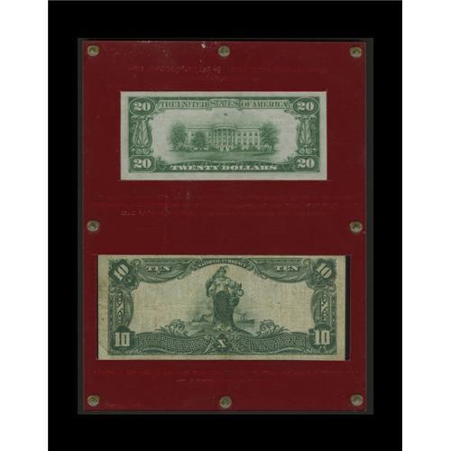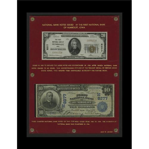 <B>Humboldt, Iowa Large and Small Nationals.</B></I><BR>Humboldt, IA - $10 1902 Plain Back Fr. First NB Fr. 625 Ch. # (M) 8277 VF<BR>Humboldt, IA - $20 1929 Ty. 2 First NB Ch. # 8277 Gem CU.<BR>Examplars of each of the two different sizes of Nationals printed from here. Housed in a red Capital Plastics holder with historical information about the issuing bank and Nationals in general. An attractive display item from a none too available institution.