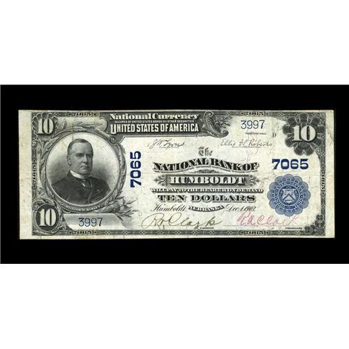 <B>Humboldt, NE</B></I> - $10 1902 Plain Back Fr. 624 <B>The NB of Humboldt</B></I> Ch. # 7065<BR>This is a very rare bank which issued large examples only. This is one of five notes listed in the census. <B>Fine-Very Fine,</B></I> with two color signatures of R.V. Clark, A. Cashier and R.A. Clark, V. President.<BR><BR><b>Shipping:</b> Coin/Currency (<a target="_blank" href="http://www.heritageauctions.com/common/shipping.php">view shipping information</a>)