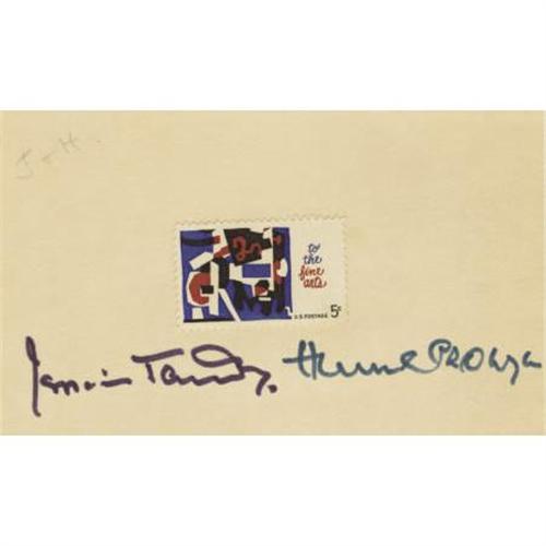 <B>Hume Cronyn and Jessica Tandy Autographs.</B></I> A 3" x 5" card, with a five-cent commemorative postage stamp affixed, signed by Hume Cronyn and his Oscar-winning wife, Jessica Tandy, in blue and black ink respectively. The autographs extend along the base of the card. In Very Fine condition with age-toning and faint initials written in pencil along upper left corner.<BR><BR><b>Shipping:</b> Flat Material, Small (<a target="_blank" href="http://www.heritageauctions.com/common/shipping.php">view shipping information</a>)
