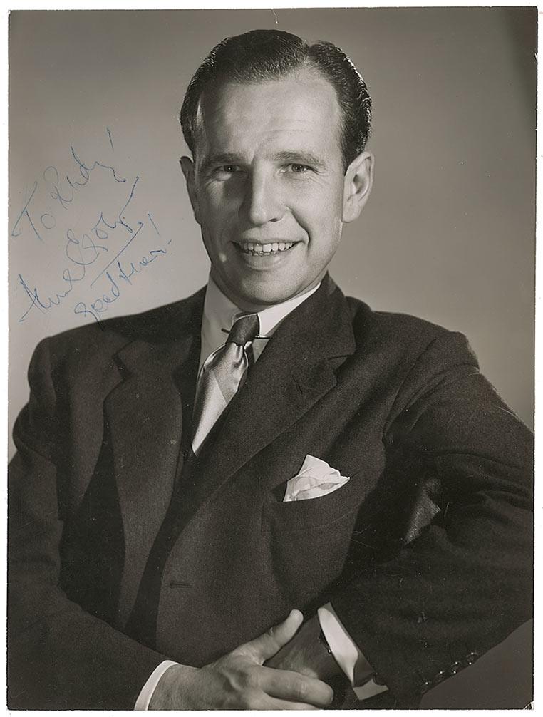 Glossy 9.25 x 12.25 Clarence Bull photo, signed and inscribed in blue ballpoint, “To Rudy! Hume Cronyn, Good Luck!” In very good condition, with scattered surface marks and dings, trimmed borders and some irregular ink adhesion to signature.