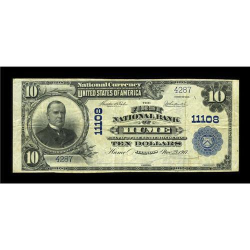 <B>Hume, IL</B></I> - $10 1902 Plain Back Fr. 632 <B>The First NB</B></I> Ch. # 11108<BR>The paper exhibited here is most pleasing and bright for the grade. This note likely spent only a very short time in circulation, sustaining a few folds and a little bit of handling. We were the last auction house to offer a note from this bank and that was back in September of 2005. <B>Very Fine.</B></I><BR><I>From The Lincoln Collection</B></I><BR><BR><b>Shipping:</b> Coins & Currency (<a target="_blank" href="http://www.heritageauctions.com/common/shipping.php">view shipping information</a>)