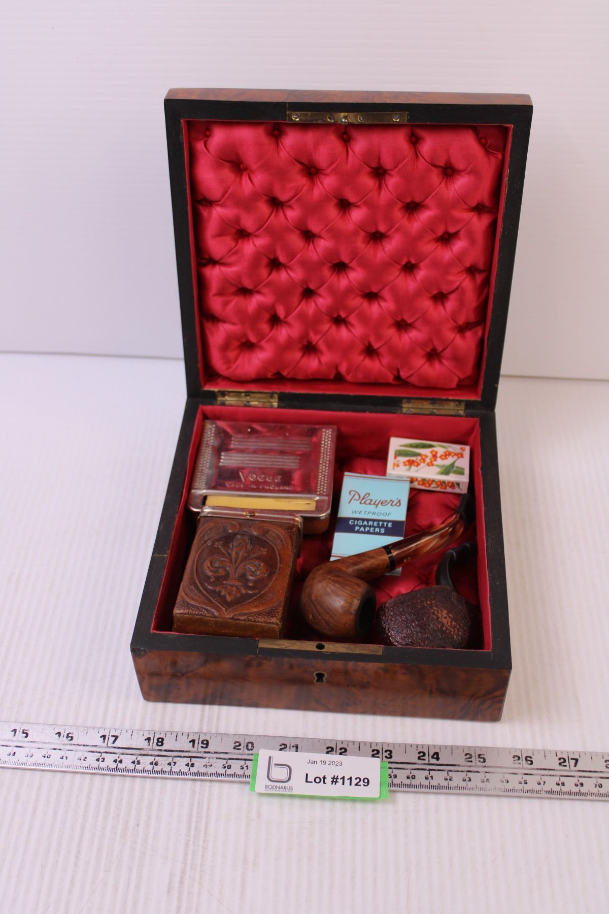 Humidor w/ (2) Pipes, Leather Cigarette Case, Vogue Case, Papers, Matches (1 Pipe Marked Rolex Italy