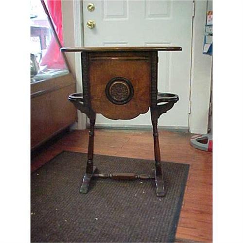 Beautifully preserved conversation piece from an era when smoking was an art. Crafted to highlight an exquisite walnut wood grain. Water mark on table top surface; easily restored. Metal liner perfect.