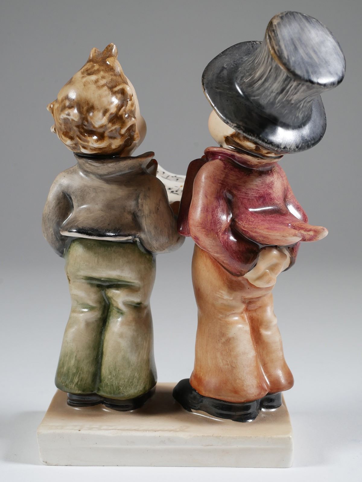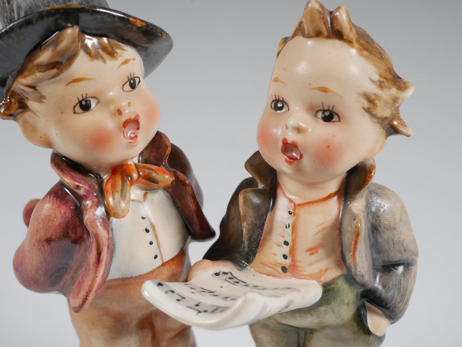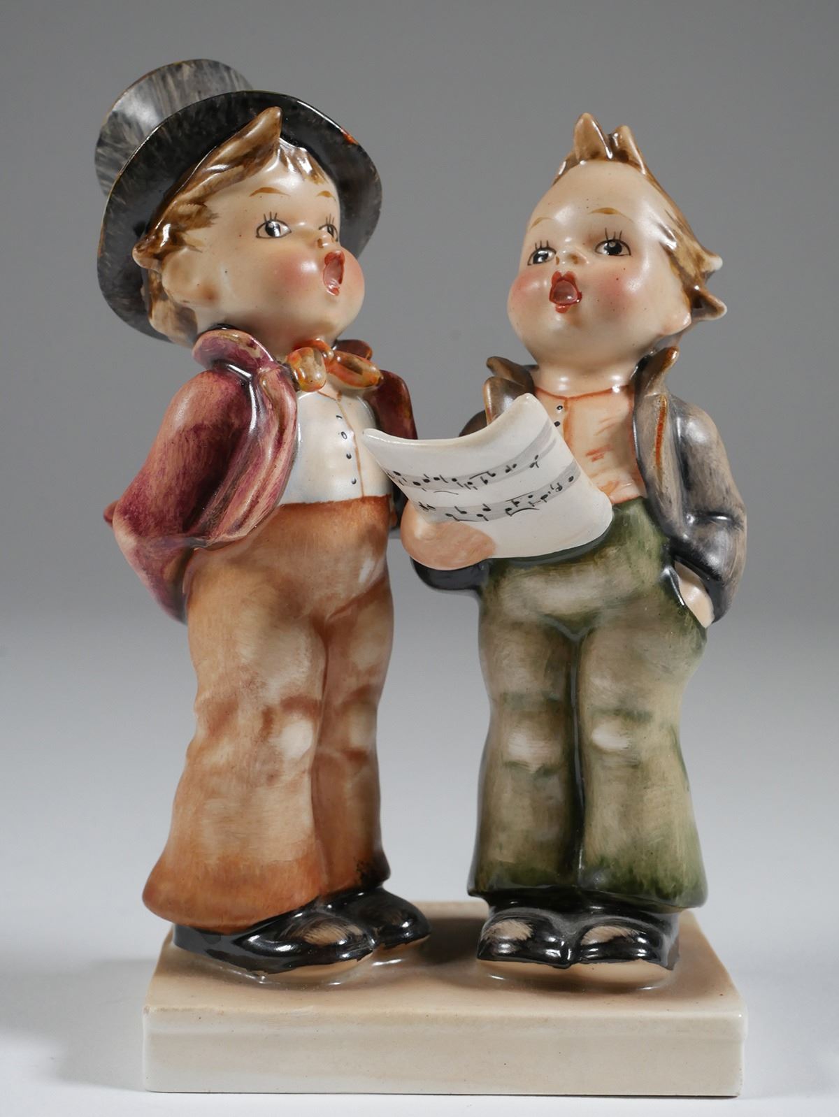 Originally modeled by Arthur Moeller in 1939. Has a small "lip" of top edge of base. Old name "The Songsters". Permanently retired fall of 1995 and will not be produced again. Hummel measures 5 1/4" tall, Has incised crown mark, TMK-1, Hum 130. No cracks, chips, crazing or repairs. No box.