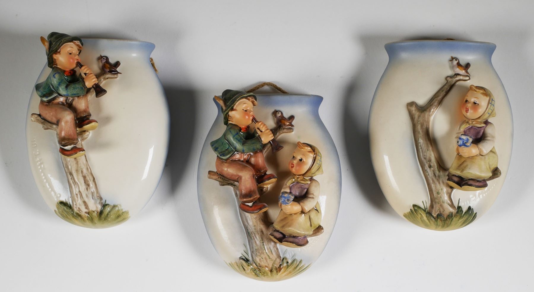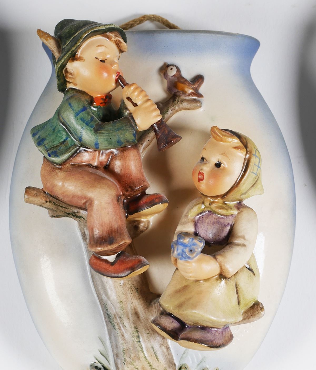 Hummel 360 wall Boy & Girl wall pocket vase set. Incised on back "(c) by W. Goebel 1958" Temporarily withdrawn from production 31 December 1989. Hummel wall pockets measure 4 1/2" x 6" tall, all are TMK-3, Hum 360/A, 360/B, 360/C . No cracks, chips, or crazing. Had small chip on boy's leg. Restored by Sidmore July 1999. No boxes.
