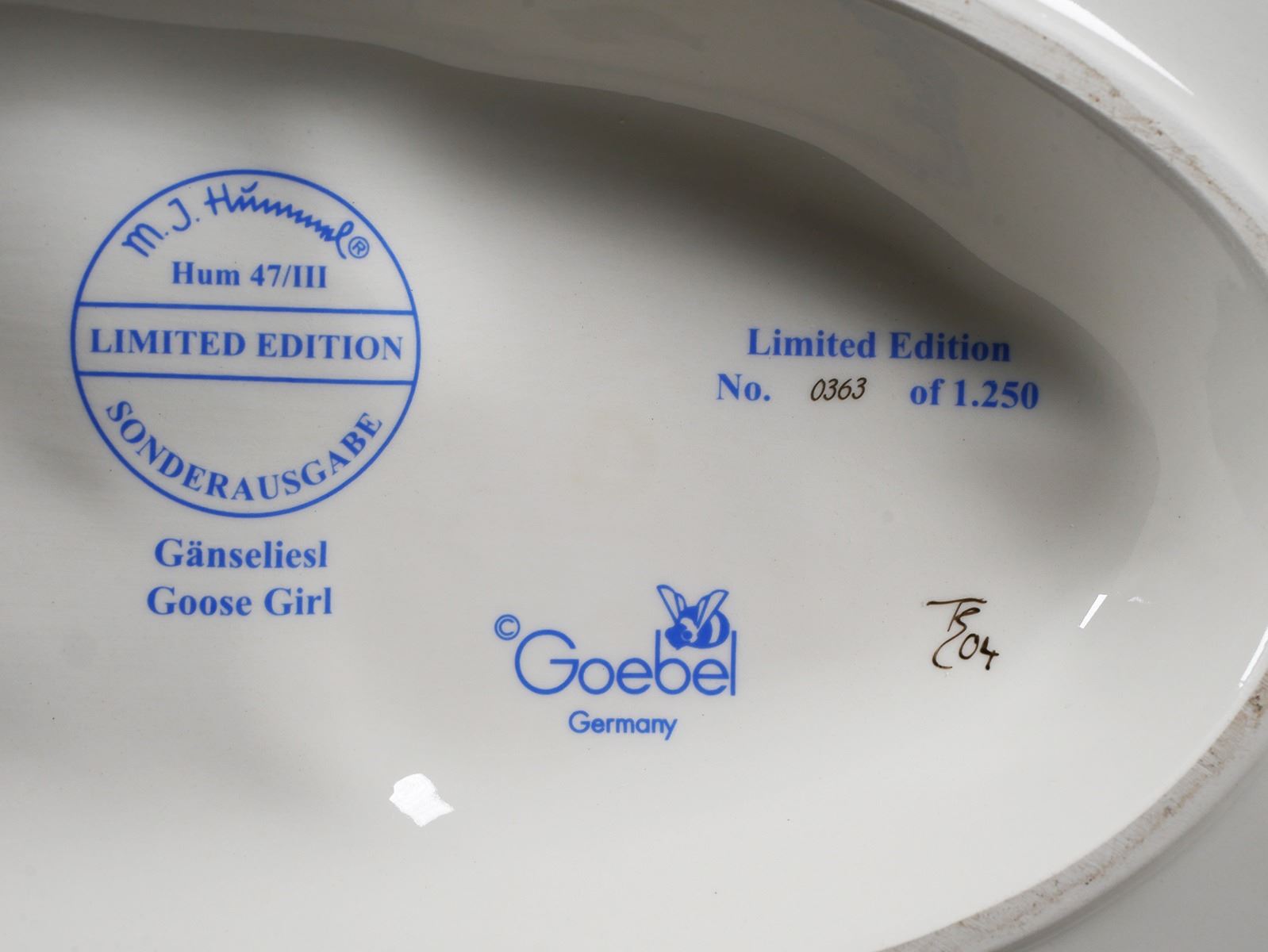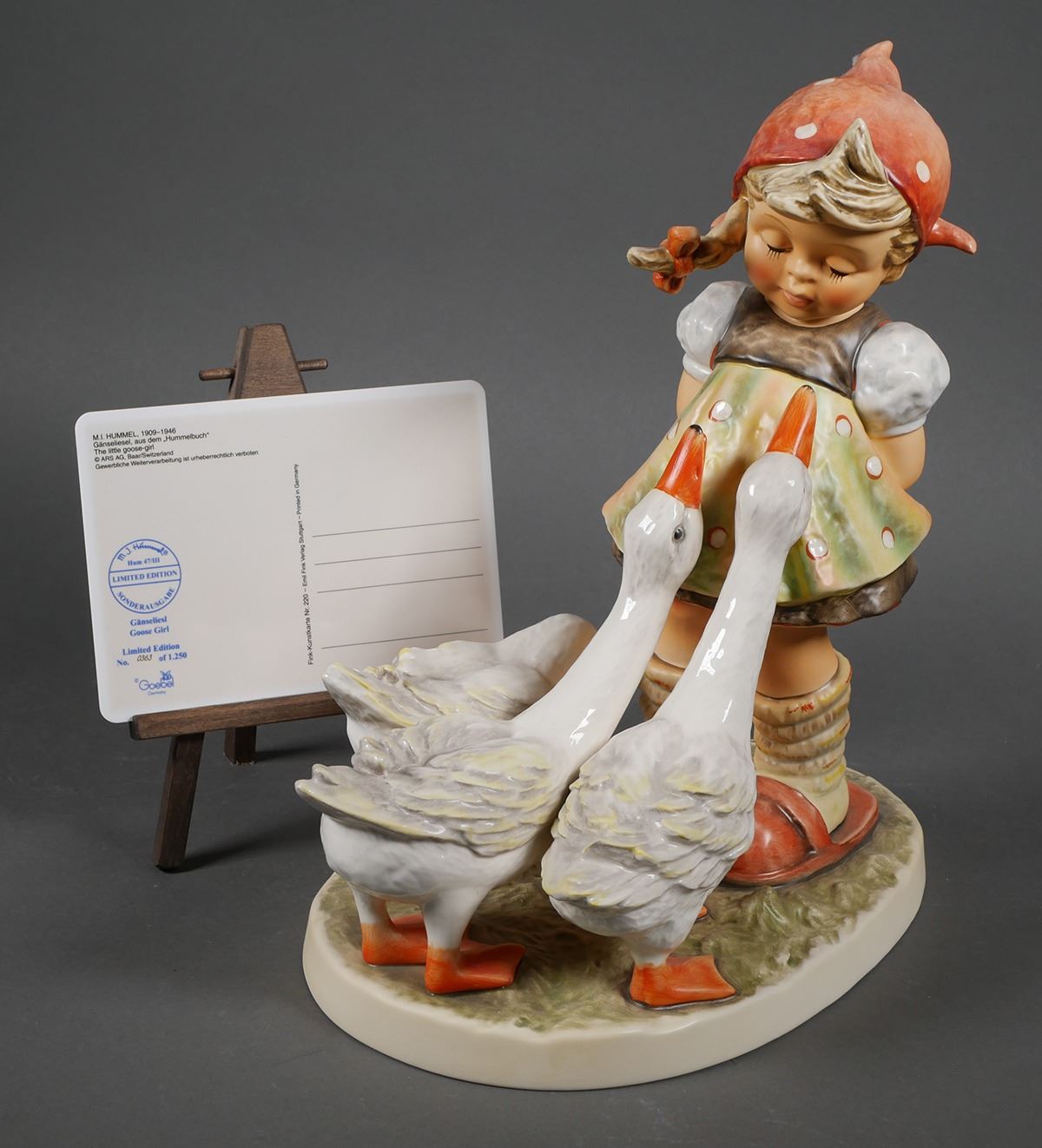 Hummel 47/III Goose Girl TMK8. This Goose Girl has three geese like the original drawing. All other editions have two geese. Limited to 1250 world wide and 500 in North America. This piece is No. 363. A ceramic post card copy of the original drawing came with this piece. Backstamp on figurine and post card "M I Hummel Limited Edition Sonderausgabe Limited edition No. 0363 os 1250". Hummel measures 12 1/2", Hum 47 TMK-8. No cracks, chips, crazing or repairs. Box included.