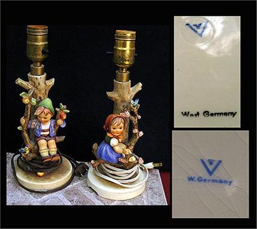 Hummel Apple Tree boy and Girl lamps #229 and #230 TMK3 standing 10 1/2" tall. Original electrical wiring. Girl has a large chip out of base but still useable