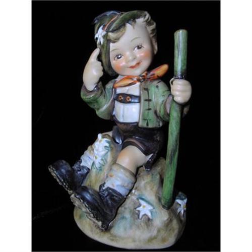 <P>Depicts an elfin-like boy sitting on a rock with a green walking stick (green walking sticks indicate that this is an older model -newer models have a dark gray stick).