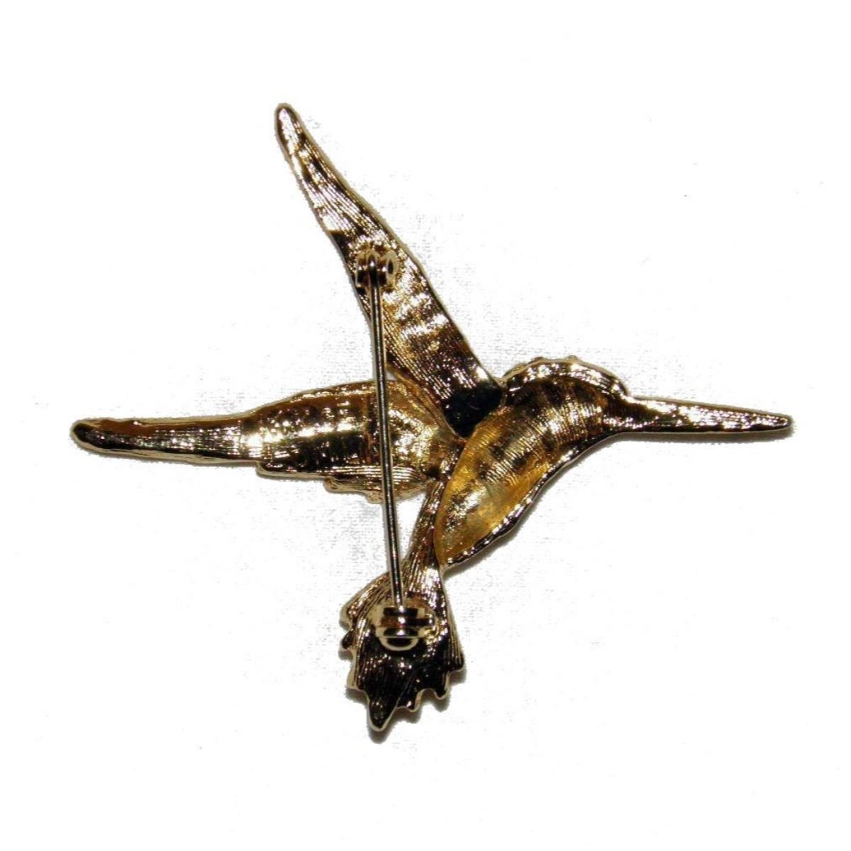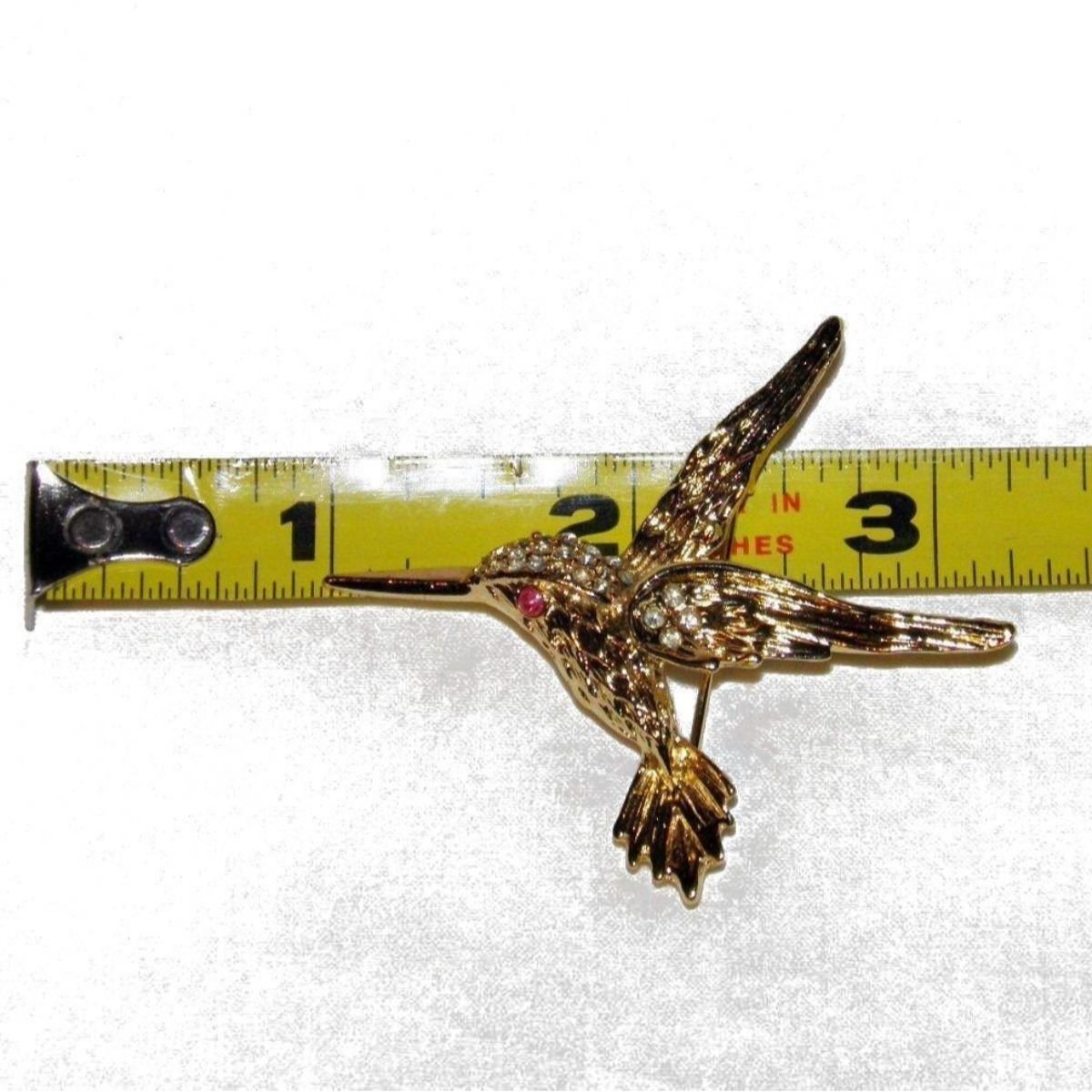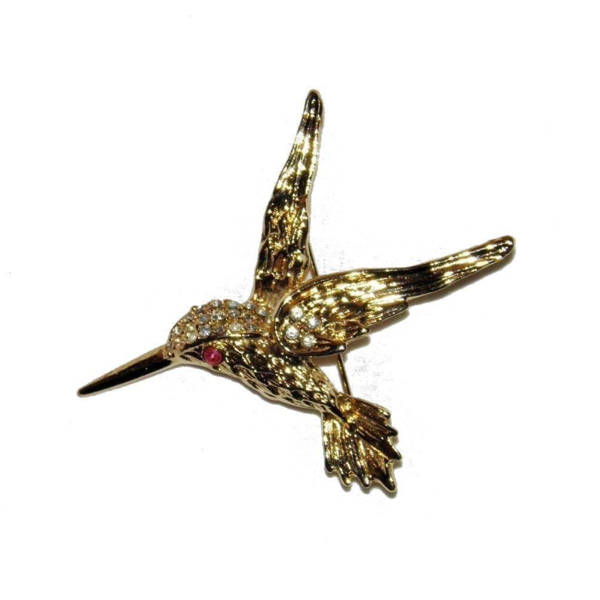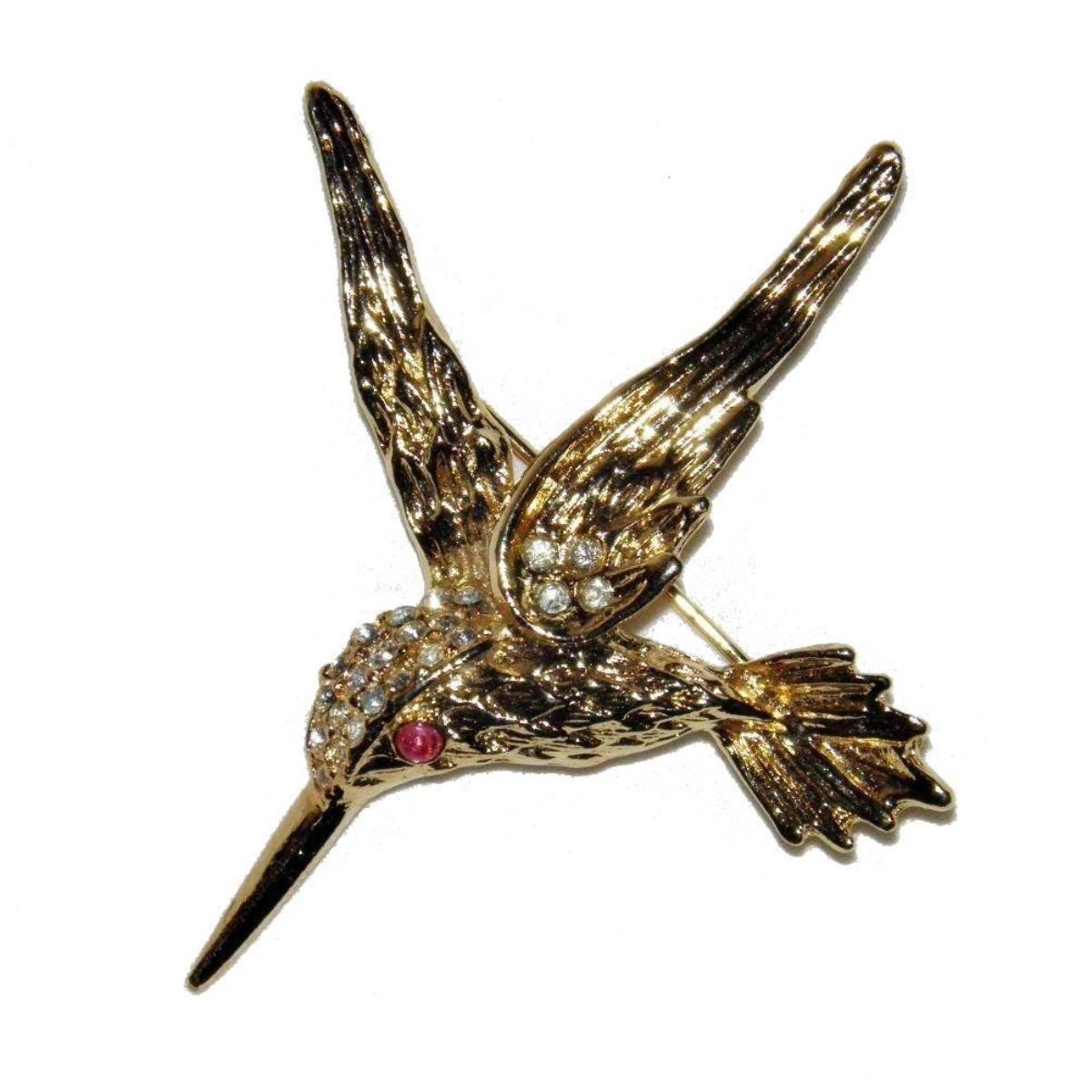 Upscale Designer Jewelry (Costume) "Hummingbird" Brooch 2 3/8" x 2 1/8" D. M. Lind Rhinestones in 14k Gold Electroplated Setting Lovely Hummingbird brooch by D. M. Lind. There are clear rhinestone accents with a pink rhinestone eye, the setting is 14k gold electroplate, and this beautiful brooch is in undamaged condition. The photos are an important part of the description, so please carefully review the pictures. - 10064-040618-EB-78514