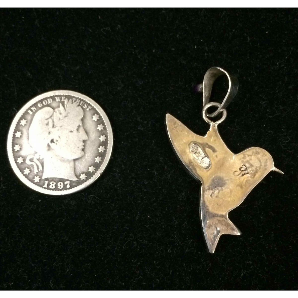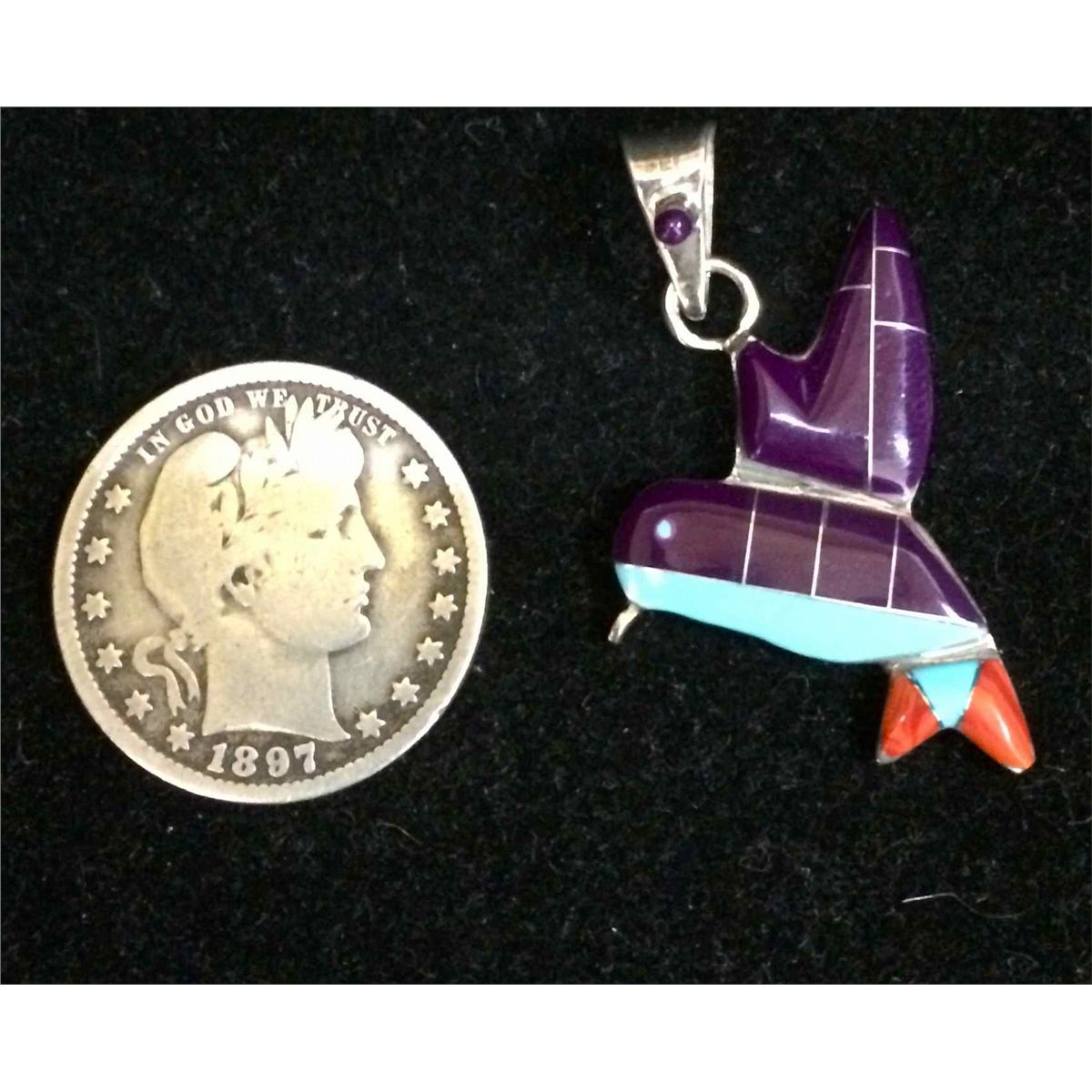 This is a Zuni-style hummingbird pendant, it is marked Sterling on the back, but has no makers hallmark. It weighs approximately 2.5 g, and has channel inlay turquoise coral and lapis.