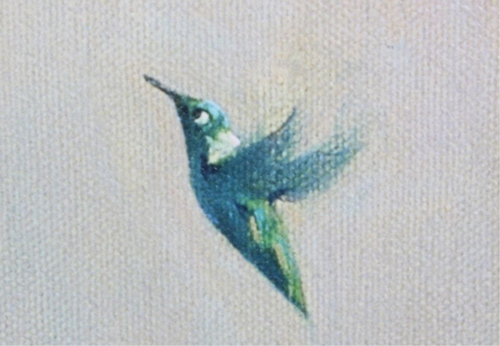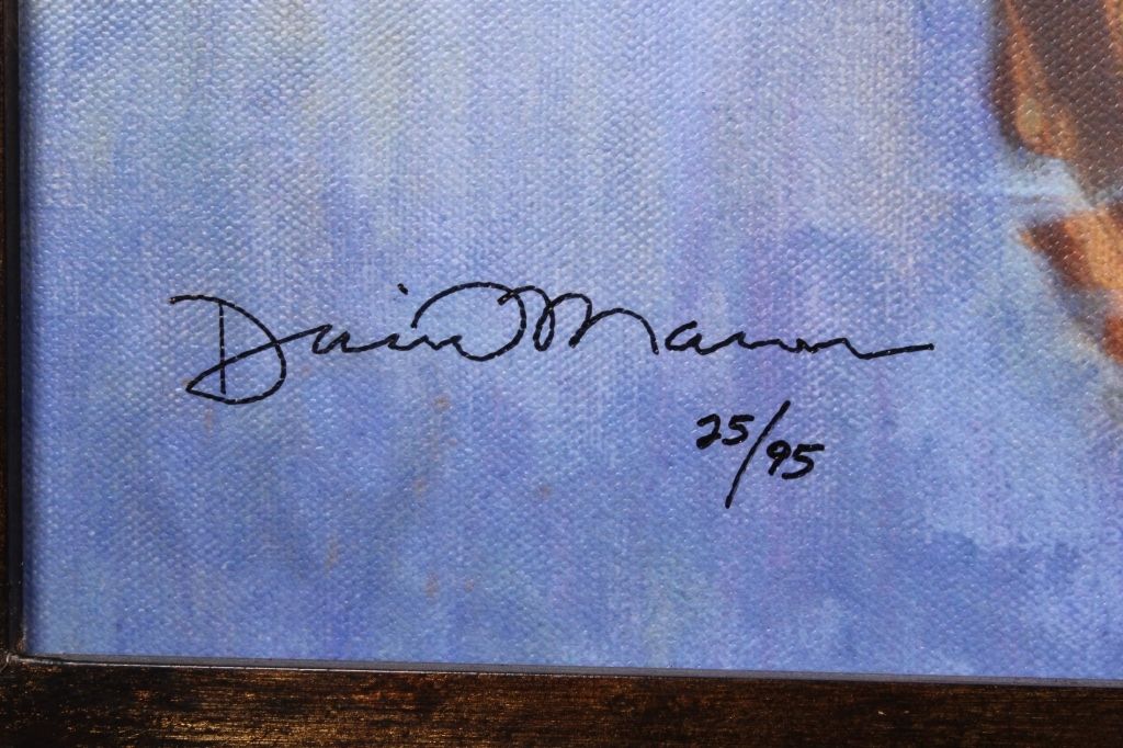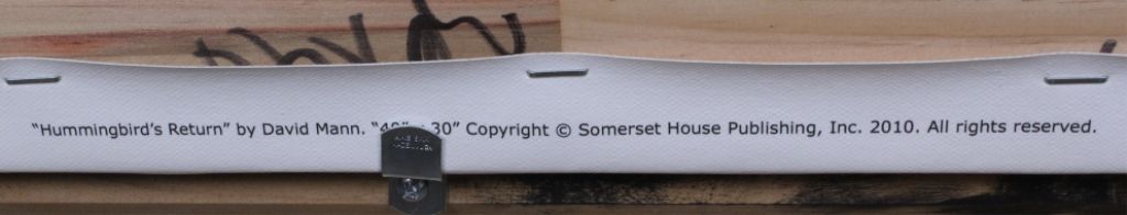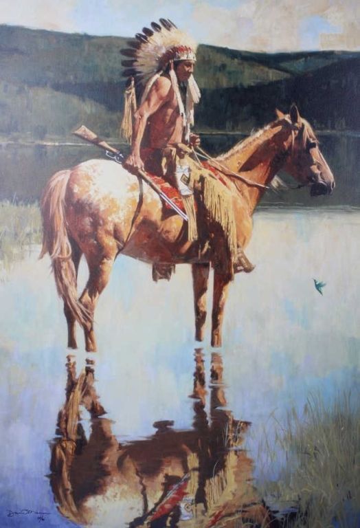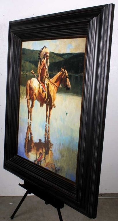 This is an original artwork Giclee Photographic Print on canvas. This is hand signed and numbered by the artist in the lower left. The piece is in a beautiful frame and the artwork features a Native American Chief standing before the returned hummingbird with his reflection in the water. This is a rare piece with a very low run and numbered 25/95. This is in great condition. The frame measures 44.75"x54.75" and the artwork is 30"x40"