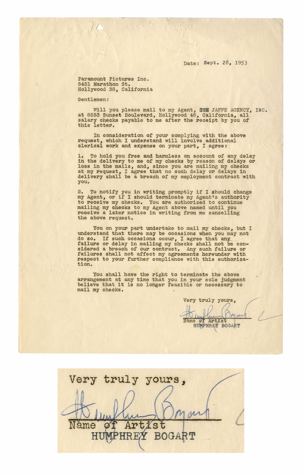 Humphrey Bogart letter signed from 28 September 1953, the time between his Academy nominated performances in ''The African Queen'' and ''The Caine Mutiny''. Here, Bogart authorizes Paramount Pictures to send his checks to his agent, The Jaffe Agency. Bogart's agent, Sam Jaffe, once took a $100,000 life insurance policy out on Bogart when Bogart's then wife, Mayo Methot, produced a pistol at a dinner party and threatened to kill Bogart if he left her. Letter measures 8.5'' x 11''. Several staple punctures to top producing small tear, overall very good plus condition with a stylized signature from Bogie. With Beckett COA.