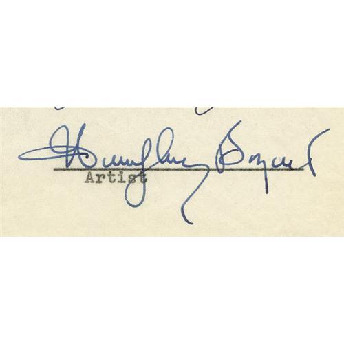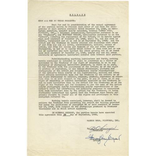 <B>Humphrey Bogart Signed Contract.</B></I> A one-page document dated September 22, 1953, severing Humphrey Bogart's relationship with Warner Bros. after 15 years. The document brought a mutual termination to an earlier employment contract from 1946, during which Bogart appeared in <I>The Big Sleep</B></I> and <I>Treasure of the Sierra Madre.</B></I> After the release of <I>The Caine Mutiny</B></I> and <I>Beat the Devil</B></I> in 1953, Warner Bros. decided to re-examine their relationship with the actor. Since the 1946 agreement, Bogart had appeared in only four films for Warner -- and nine for other studios -- and rejected three of their scripts over two years, while scoring various successes elsewhere. An excellent document marking the end of an era, it features an exceptional signature by Bogart in blue ink, and is in Fine condition with moderate tanning and wrinkling, and a fold crease across the center. <I>Accompanied by a certificate of authenticity.</B></I><I>Accompanied by LOA from PSA/DNA.</B></I><BR><BR><b>Shipping:</b> Small Flat (<a target="_blank" href="http://www.heritageauctions.com/common/shipping.php">view shipping information</a>)