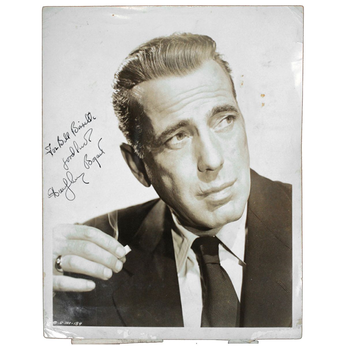 Exceptional signed photo by film icon Humphrey Bogart, here in full character as a dashing knockabout with cigarette in hand. 8'' x 10'' photograph is perfectly signed ''For Bill Bissette / good luck / Humphrey Bogart''. On the verso is a piece of paper with the cast of ''Dead Reckoning'' and a stamp ''Property of the News Library'' with the date 27 January 1947. In very good condition with a few light creases, minimal spotting to the upper right portion and rounded corners. Absolutely stunning photograph accompanied by a COA from PSA/DNA.