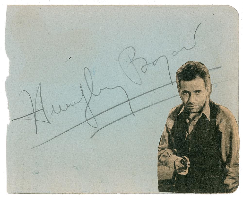 Vintage pencil signature, “Humphrey Bogart,” on a light blue 5.5 x 4.5 album page, with a clipped photo affixed to right corner. In very good condition, with scattered toning and wrinkling, rough left edge, and mild impressions from signature on reverse.