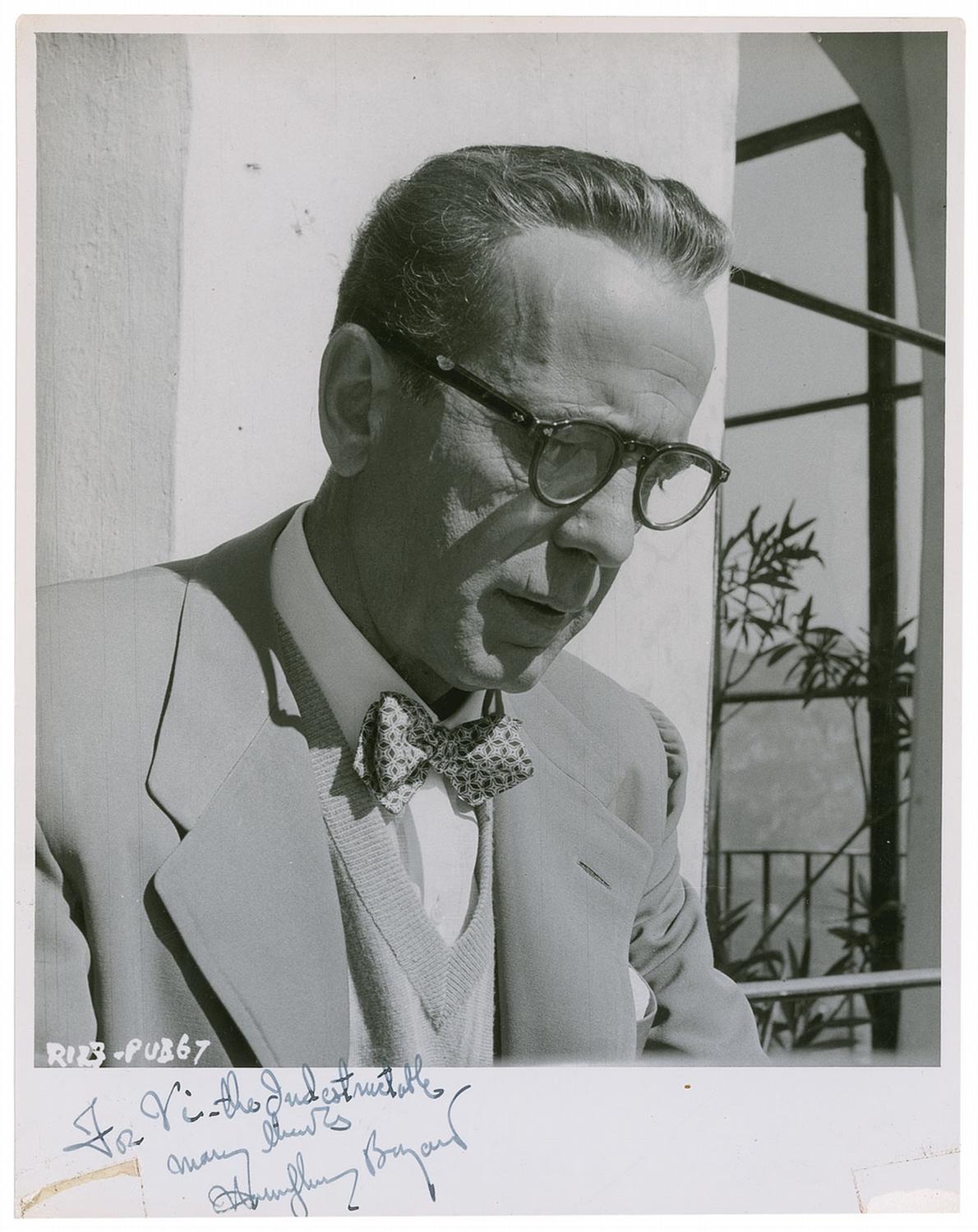 Vintage glossy 7.75 x 10 photo of an older Bogart in glasses and a bow tie, signed and inscribed in fountain pen “For Vi–the Indestructable, Many thanks, Humphrey Bogart.” In very good condition, with scattered creases and surface marks, light rippling to emulsion, and tape and adhesive remnants to bottom corners, some in close proximity to signature and inscription. The photo’s recipient, Violet Murray was a longtime wardrobe mistress who worked on over 20 films during the 1950s and 1960s, including The African Queen and The Lion in Winter. Great association between Bogie and an important crew member from his Academy Award winning film.
