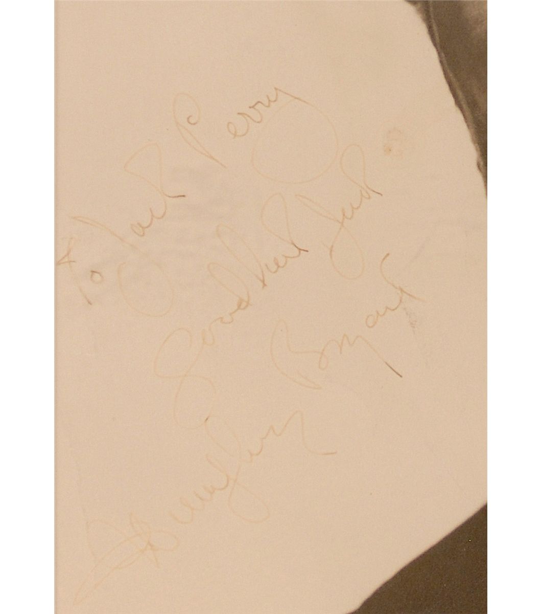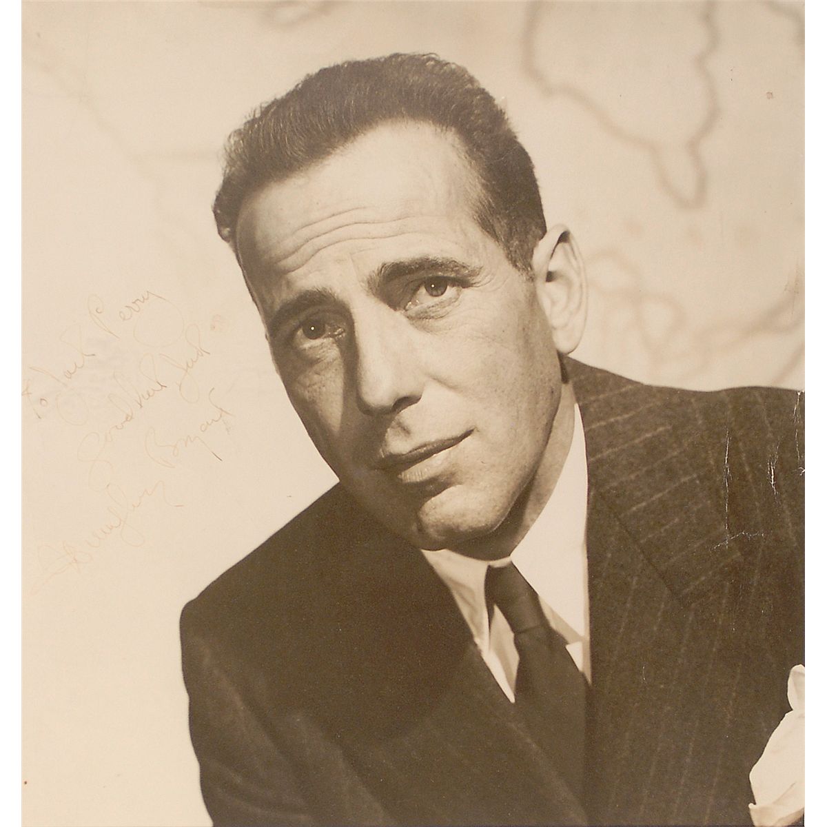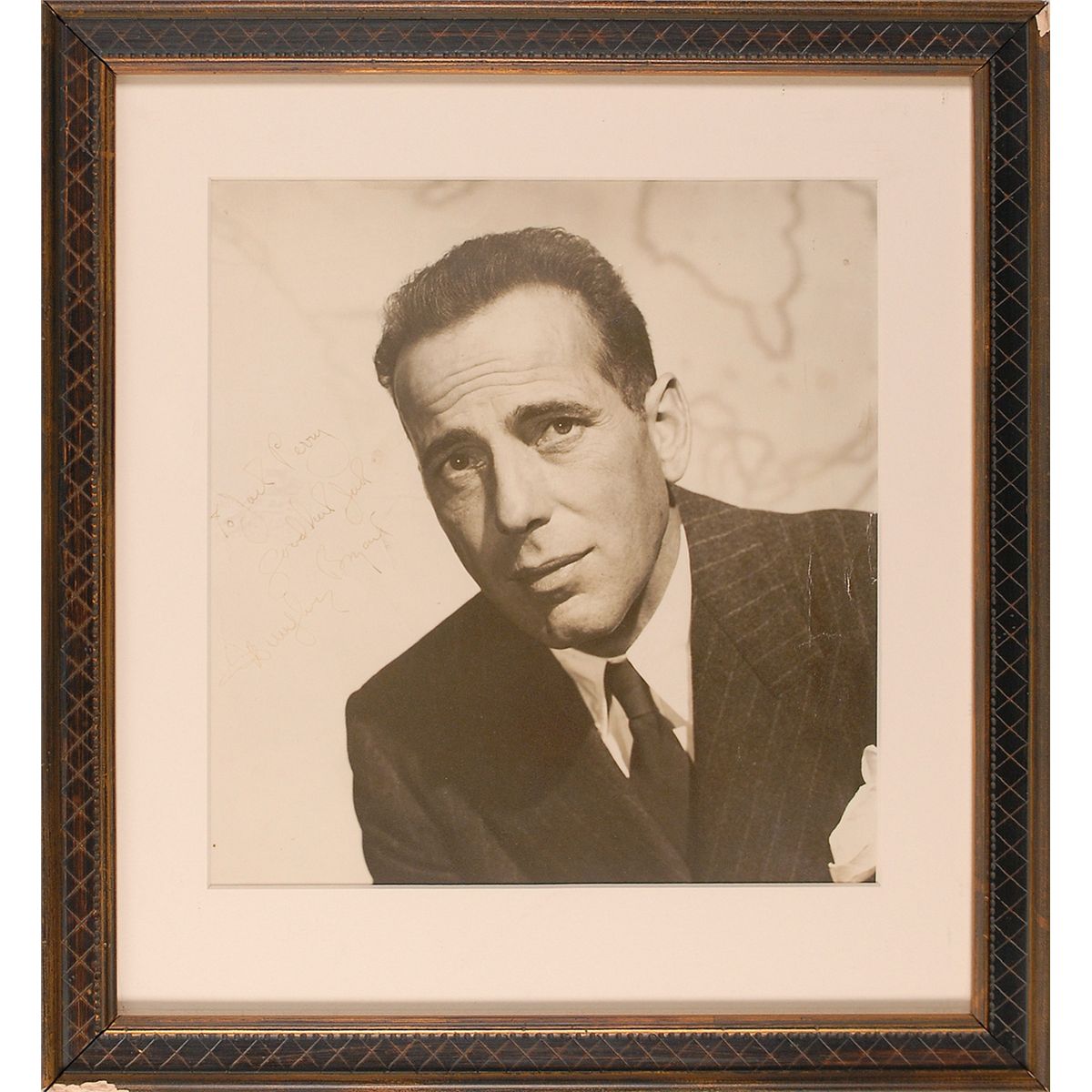 Vintage matte-finish 10.5 x 11 photo of Bogart in a pin-stripe suit, signed and inscribed in black fountain pen, “To Jack Perry, Good luck Jack, Humphrey Bogart.” Matted and framed to an overall size of 15.75 x 17. In very good condition, with moderate creasing to edges (a crease touching the first letter of his name), some fading, and all handwriting a few shades light but entirely readable. Also, the consignor notes that further border damage is present, but has been tastefully matted out to create a striking visual display. Bogart is quite scarce and very desirable in signed photos of this size.